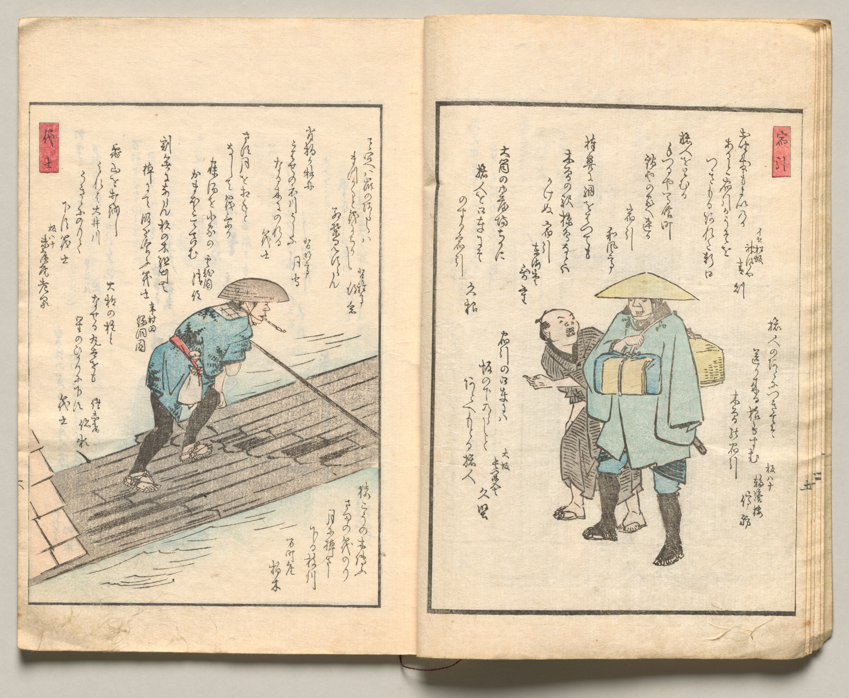 Two pages from a book opened side by side. The pages are yellowed with age. Each page has a black border around the image. The left page shows a man in a blue top and black pants with a red sash, wearing a traditional Japanese hat, using a long pole to push a boat on water. The right page shows two men; one wearing a blue robe with a conical hat, carrying a box and a basket on his back, and another man behind him wearing a brown robe. Both pages are filled with Japanese text in black ink, with a red seal in the top left and right corners respectively.