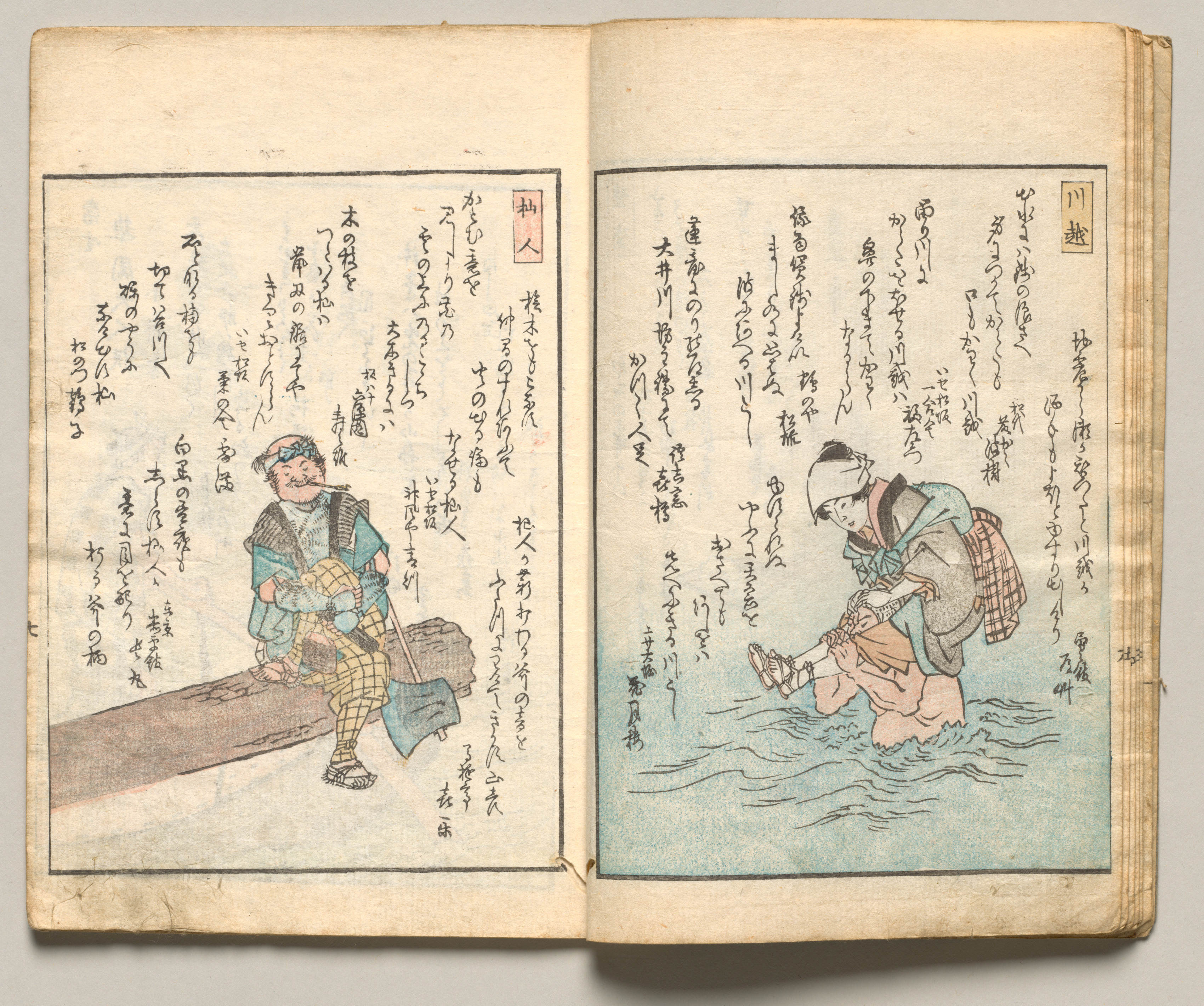 Open book with two pages. Left page: - A man sits on a log. - He wears a blue headband, blue and brown jacket, yellow and black checkered pants, and sandals. - He holds a blue cloth and a walking stick. Right page: - A man wades through water. - He wears a headband, blue robe, and checkered backpack. - The man is barefoot. Both pages have Japanese text and illustrations are in a traditional woodblock style. Pages are yellowed with age.