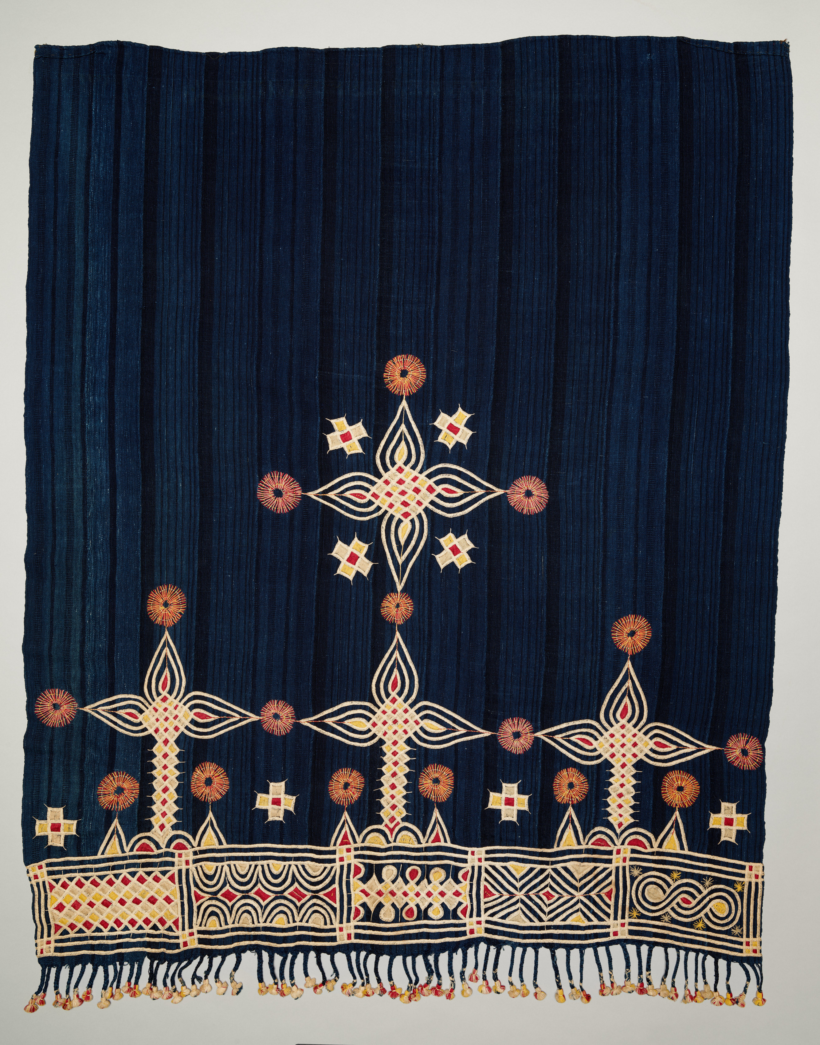 Dark blue fabric with vertical pleats. The fabric has a decorative border at the bottom with tassels. The border features a repeating pattern of geometric shapes in shades of yellow, orange, and red. Above the border, there are several symmetrical designs resembling flowers or stars with yellow, orange, and red details. A large symmetrical design is centered on the fabric, consisting of multiple pointed shapes and small circles. The background of the image is light gray. The fabric appears to be a woman's shawl or head covering.