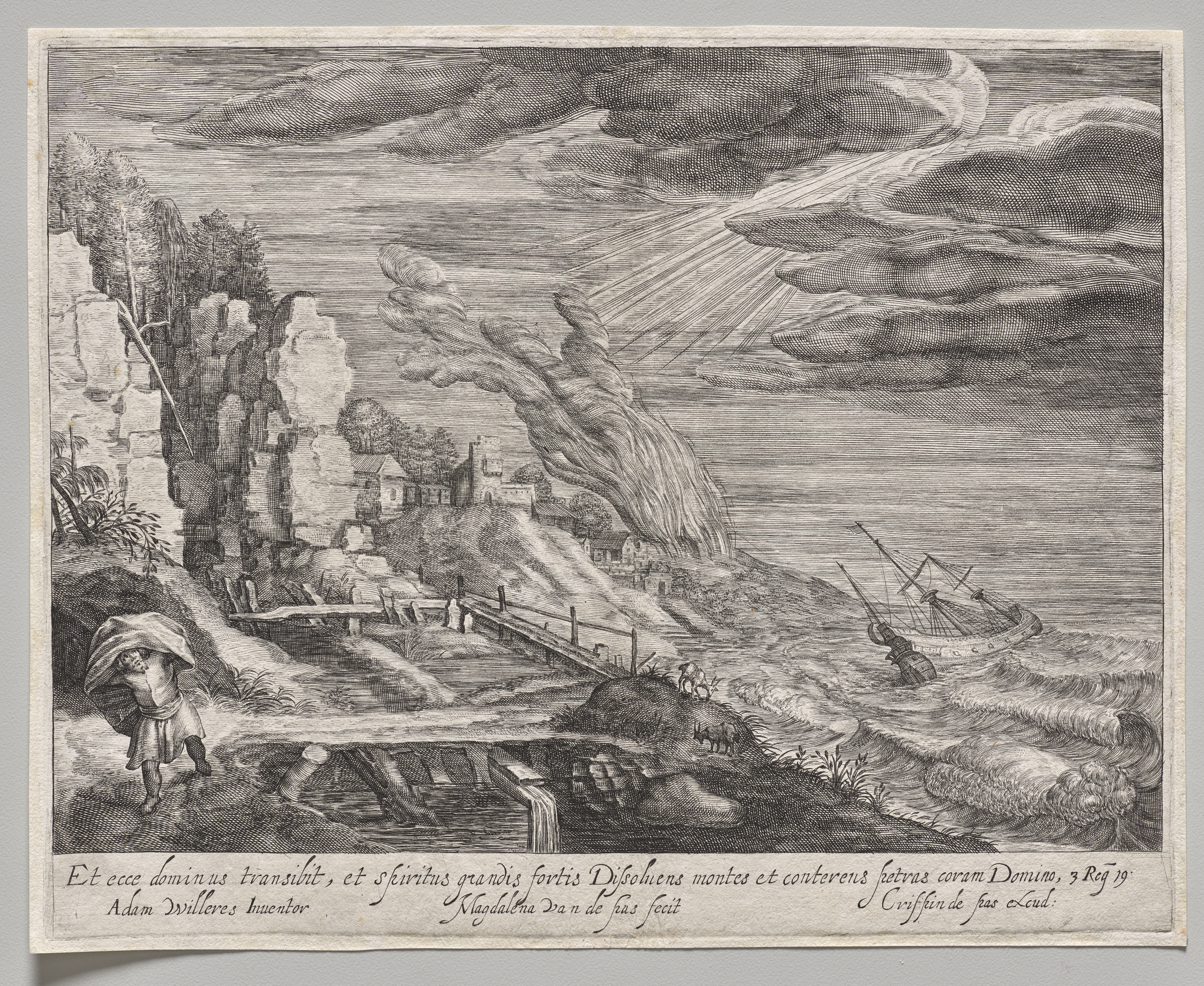 Black and white drawing of a rocky shoreline with a cliff on the left side. A man walks along a path on the left side of the image carrying a large load on his back. A bridge crosses over a small stream flowing into the sea. A boat is in the water on the right side, partially submerged. The sky is cloudy with sun rays breaking through. A town and trees are on top of the cliff in the background. Text is written in Latin at the bottom.
