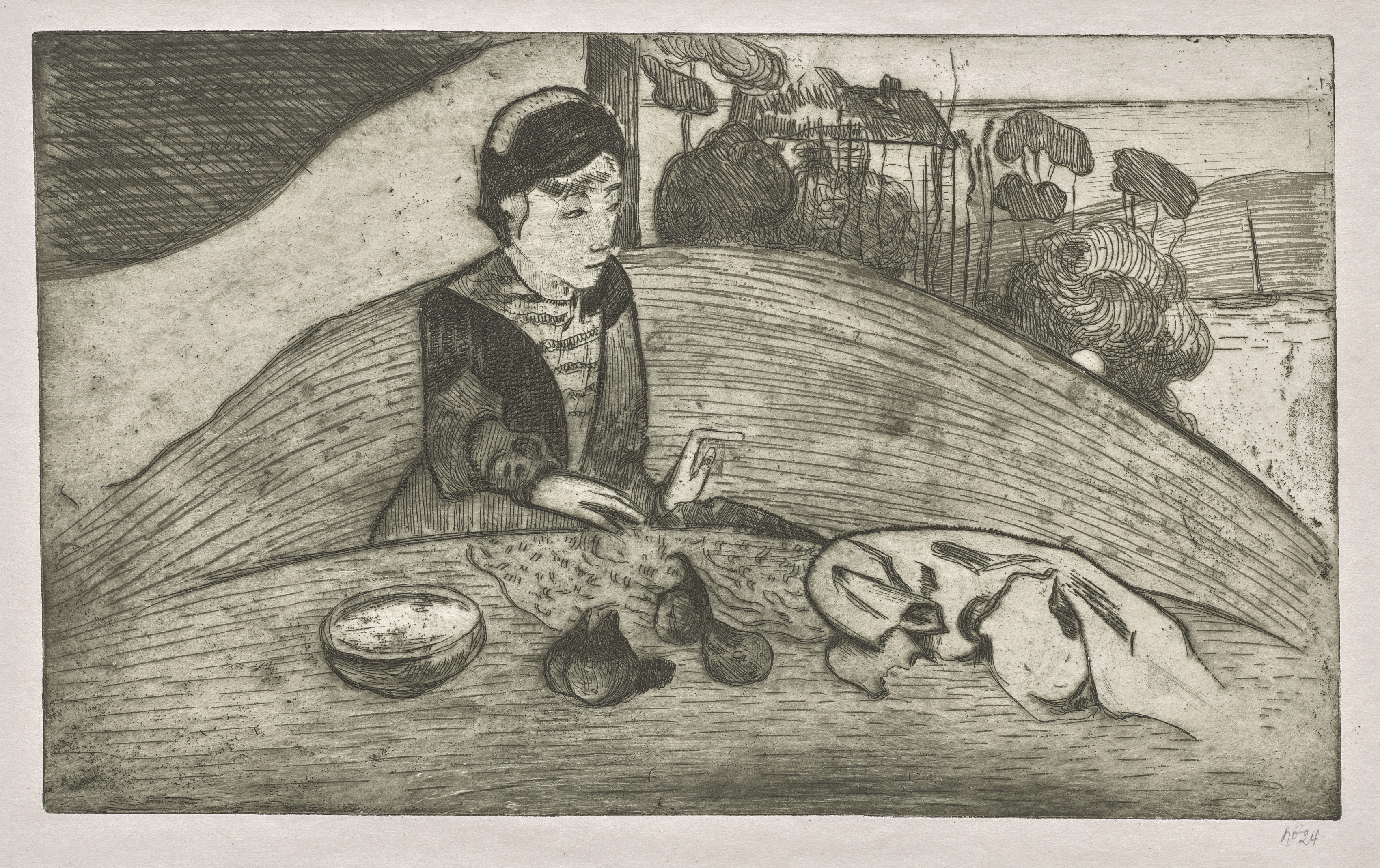 The image depicts a woman sitting at a table with figs. The woman wears a head covering and a dark dress with a lighter-colored top underneath. Her right hand rests on the table, while her left hand is not visible. The table holds a bowl, a fish, and several figs. The background features a wavy hillside with trees and a fence. A house or building is visible in the distance. The overall composition is rendered in a sketch-like style with heavy lines and shading, characteristic of Paul Gauguin's work, specifically "The Woman with Figs".