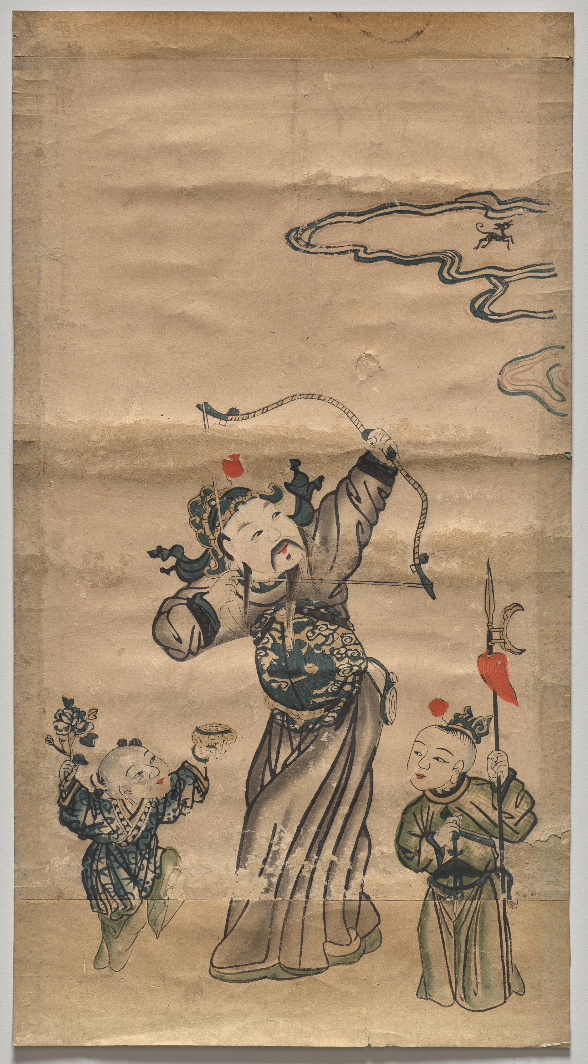 A painting on old paper of a man with long black hair and a mustache shooting a bow at a dragon-like creature; he wears a long black and gold robe and holds a bow in his left hand and an arrow in his right; a young boy to his left holds a basket; another young boy to his right holds a spear; the background is beige with a gray sky. The title of the piece is "Zhang Xian Shoots the Heavenly Dog" by an unknown artist.