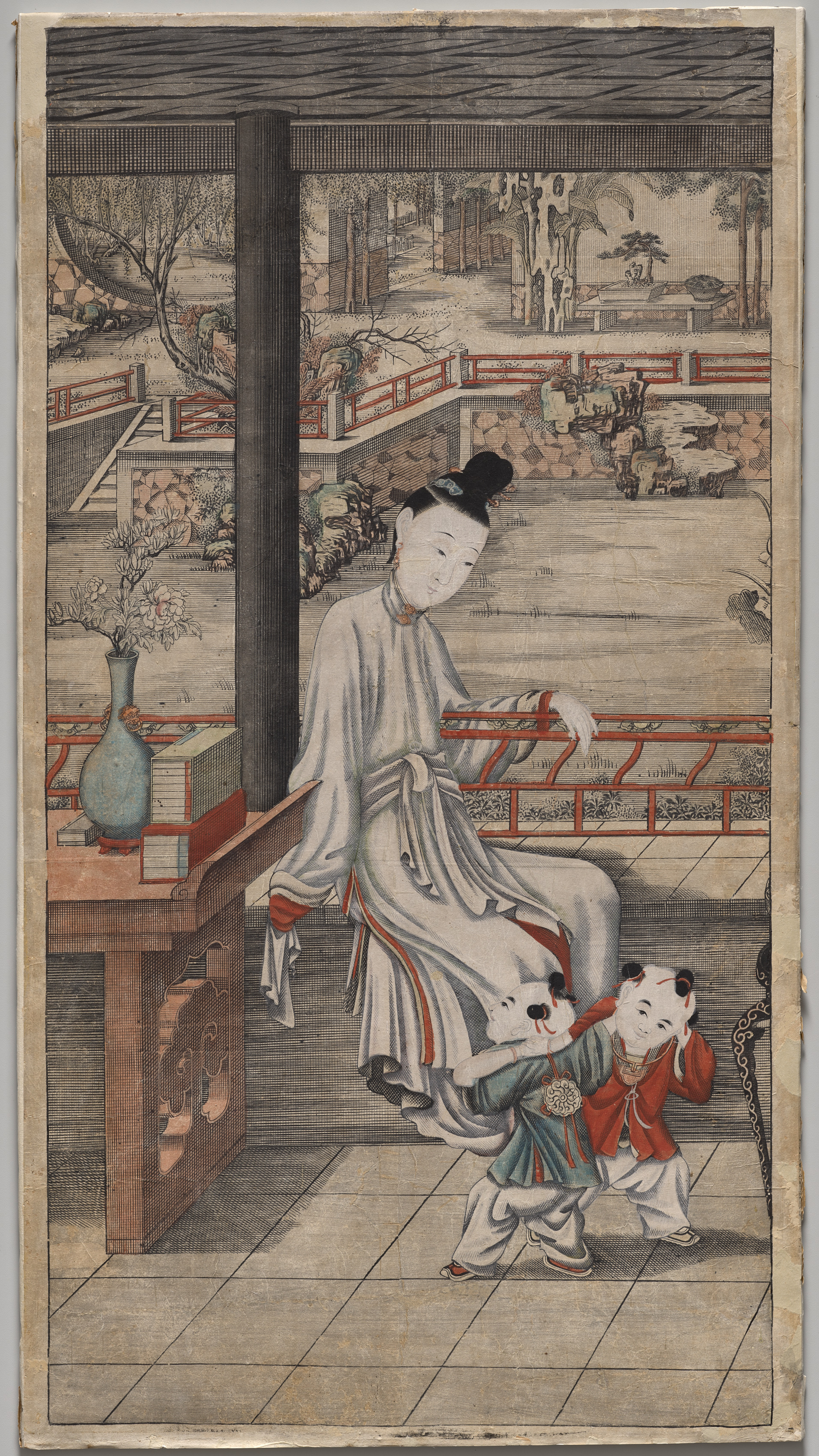 Colorful painting of a woman and two children on a balcony with a garden behind them. The woman wears a black hat, a long white robe with red, blue and white stripes near the bottom, and white pants. The children wear colorful robes. One child stands on the right wearing a red and blue robe and white pants. The second child, partially obscured, on the left wears a blue robe and white pants. The balcony has a red railing and a tiled floor. In the background, there are trees, a body of water, and a small bridge. The scene represents Gusu Beauties of the Four Seasons – Spring. It is a work by the artist Qiu Ying.