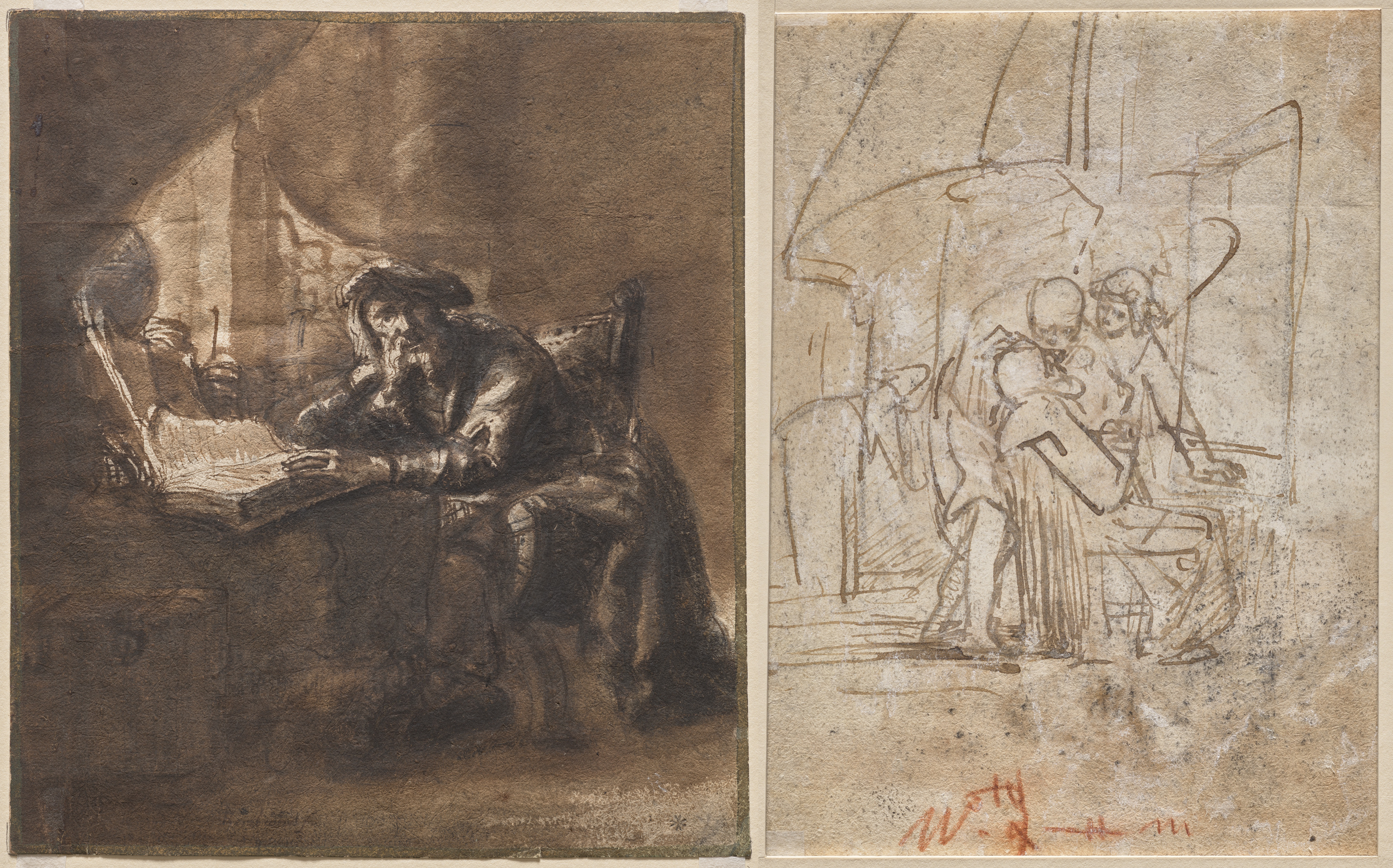 The image shows two sketches side by side. The left sketch depicts an old man sitting at a table wearing a robe and cap, with his head resting on his right hand. The man sits in a chair angled to the left. The old man looks down at an open book on the table in front of him. A window with a curtain is behind him on the left side. The right sketch depicts a scene with three people. The person on the left appears to be standing with their left arm raised. The person in the middle sits on the right side of a table and appears to be holding something in their lap. The person on the right appears to be standing. The background contains lines suggesting architectural features. The right sketch is less detailed and appears to be an initial sketch. The sketches have aged paper texture. The left sketch has brown and gray tones, while the right sketch has light brown and gray tones. The left sketch is darker. The right sketch has a red signature at the bottom.