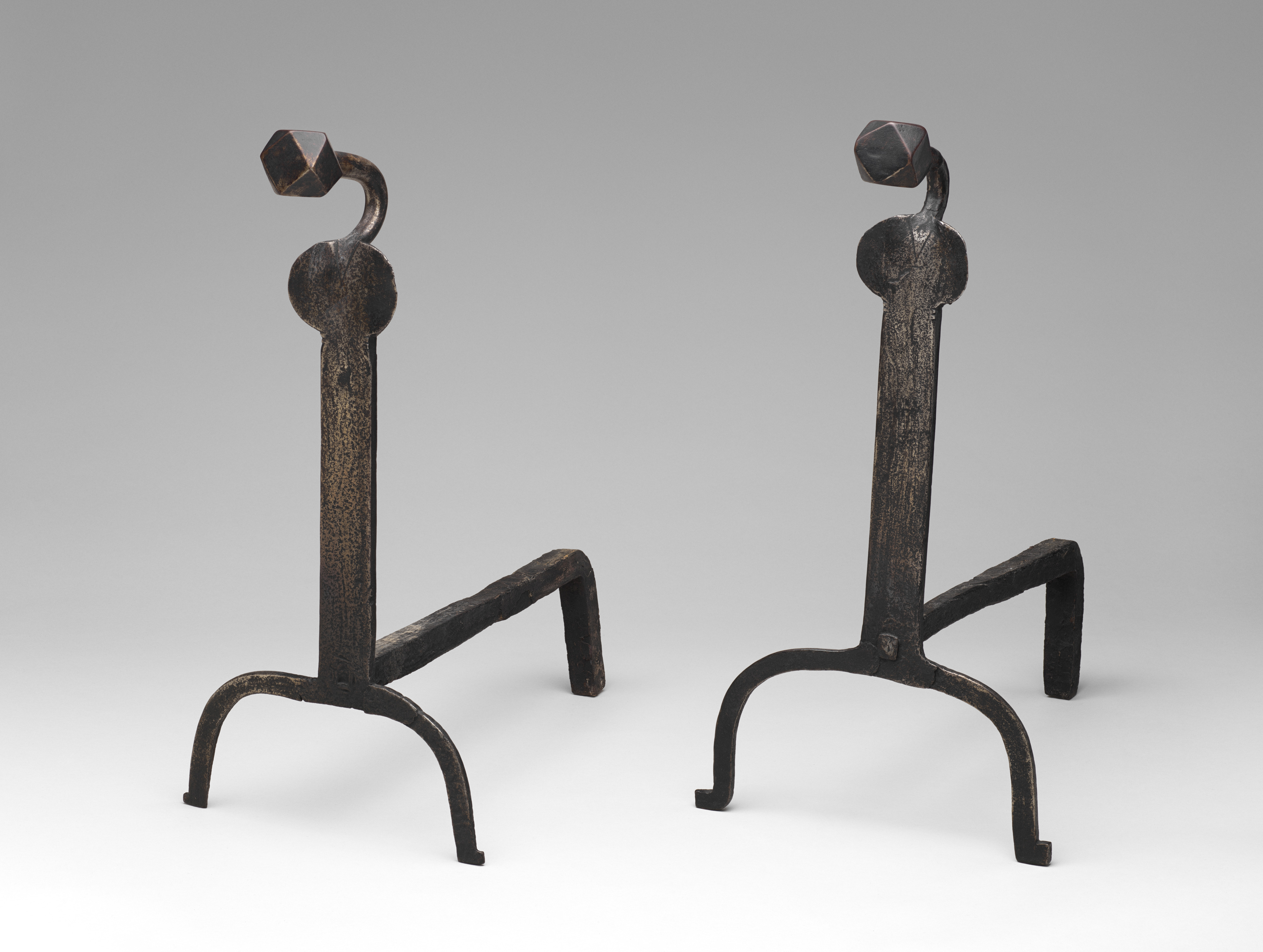 The image shows two andirons. The andirons are made of dark metal with a brown tint. They have a long, thin vertical piece in the center. A circular piece is attached to the top of the vertical piece. A curved piece extends from the top of the circular piece and bends to the left and then down. The curved piece has a geometric shape at the end. Each andiron has three legs, one straight leg at the back and two curved legs at the front. The background is gray, becoming lighter towards the bottom. The andirons are on a white surface. The andirons are by Andiron.