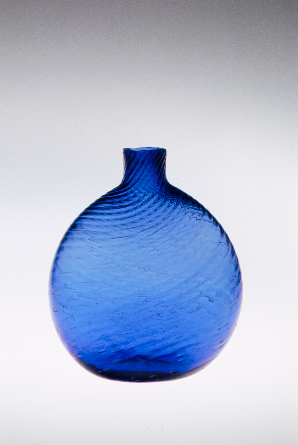 The image shows a blue glass object, titled "Pocket flask", by an unknown artist. The object is a deep blue color and has a rounded body with a narrow neck. The body of the object is bulbous and roughly spherical in shape. The surface of the object features a textured, wavy pattern that resembles the lines of a fingerprint. The background is white and gray, with the object casting a slight shadow.