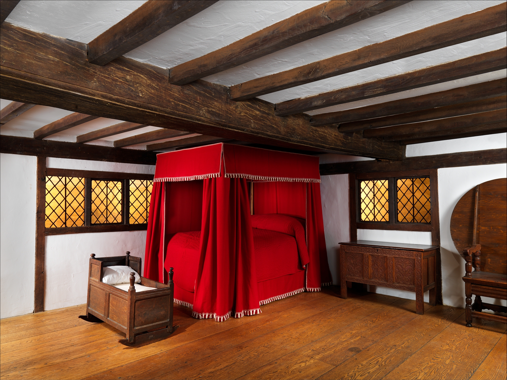 The image shows a bedroom with a red four-poster bed in the center. The bed has a red canopy with tassels along the bottom edge and red curtains hanging down on all four sides. The bed frame is not visible. To the left of the bed is a small wooden chest with a white object on top. To the right of the bed is a wooden dresser and what appears to be a wooden folding screen. The room has white walls and a white ceiling with exposed dark wooden beams. There are two windows on either side of the bed, each with a decorative metal grate over it. The floor is made of light-colored hardwood planks. The overall style of the room appears to be medieval or Tudor-style. The room, from the Hart House, Ipswich, Massachusetts.