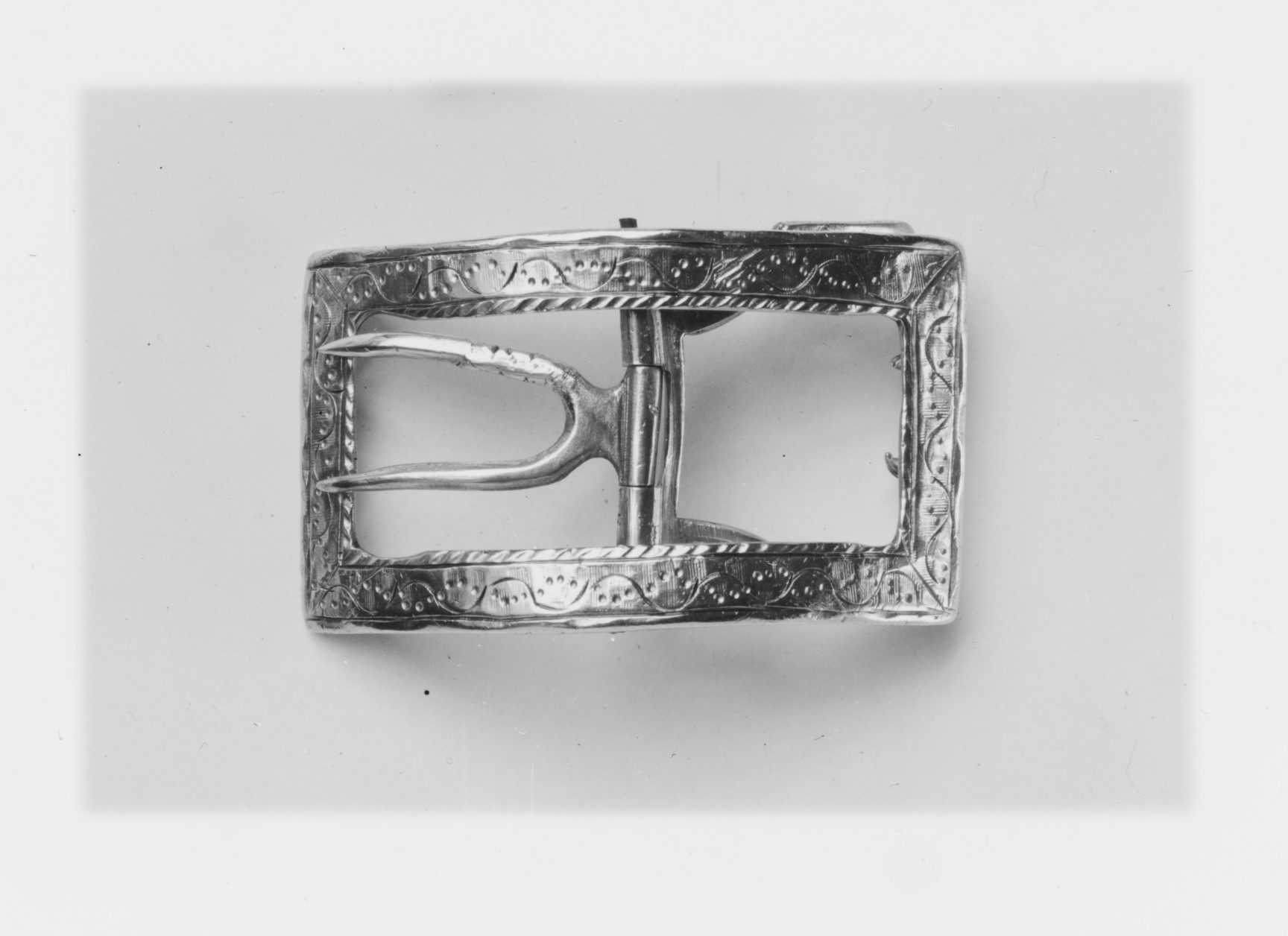 Silver buckle titled "Shoe Buckle", rectangular with rounded corners and a decorative rope-like border around edge; two prongs on left side attached to center bar; prongs curve towards right; background white.