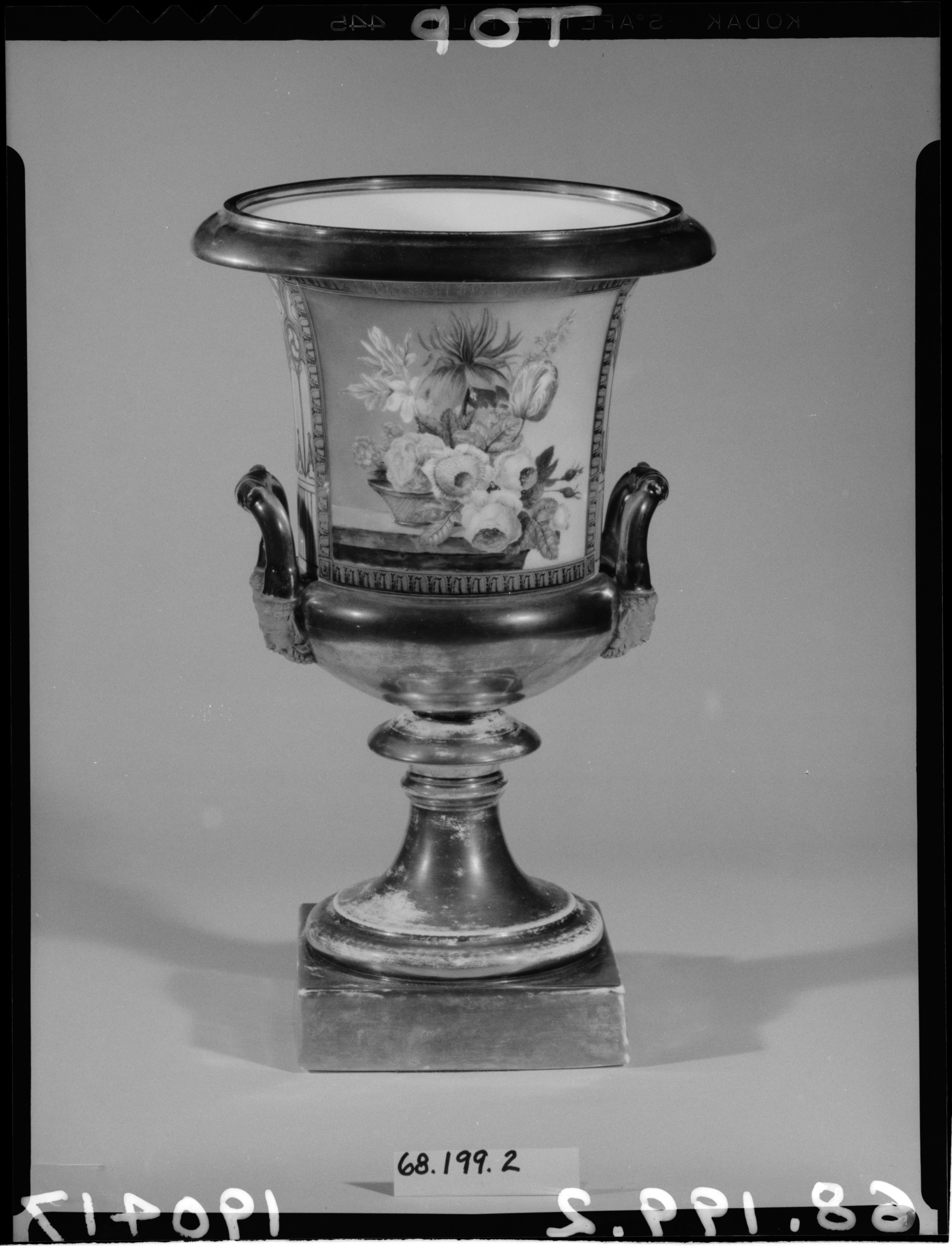 Black and white photograph of an urn by S. Porcel. The urn has a wide, flared mouth with a dark rim, a body that tapers outward then inward to a narrower base. Two handles protrude from either side. A painted scene of flowers in a basket is on the body. The urn sits on a short, square base. Handwritten text is at the bottom.
