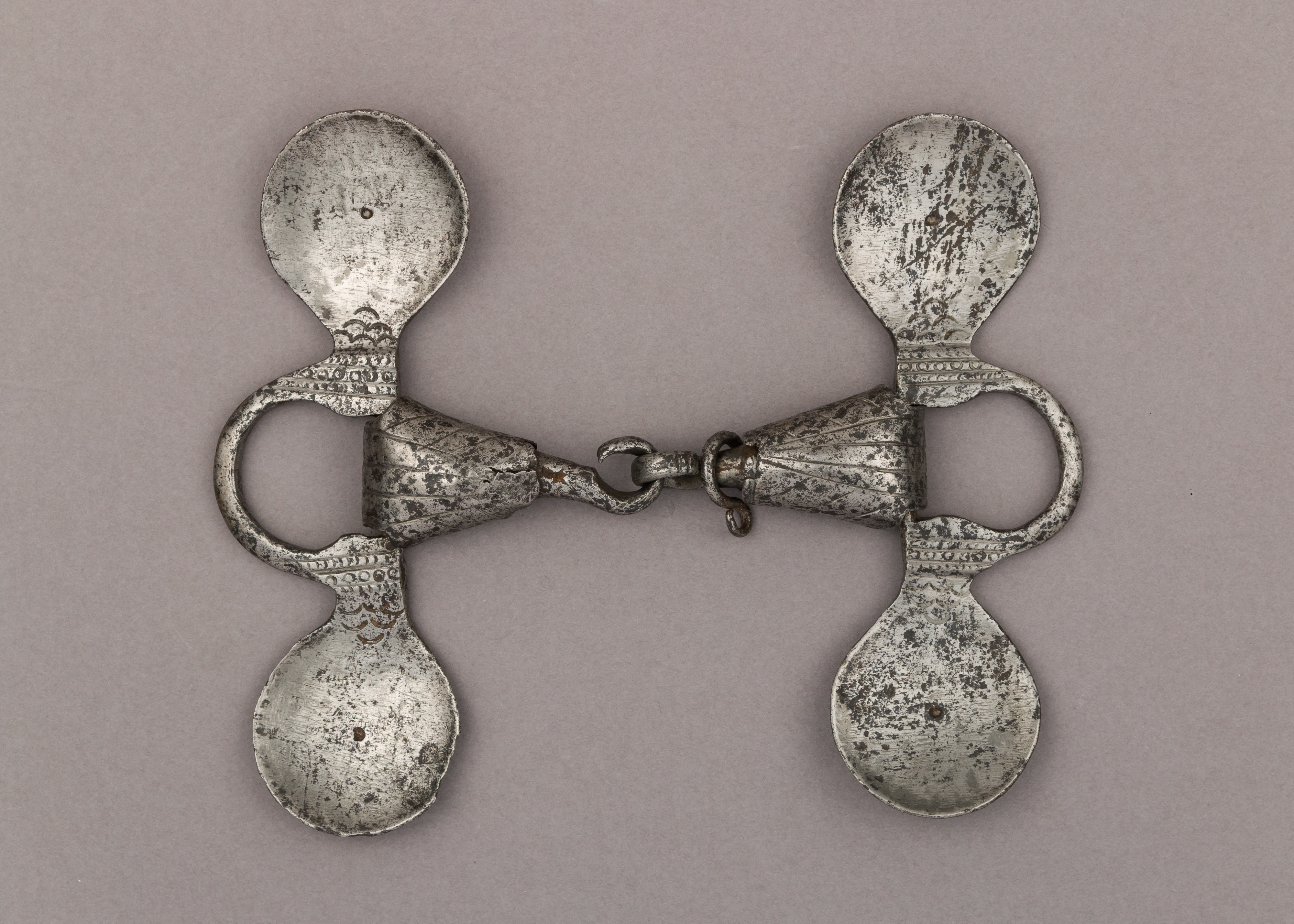 The Snaffle Bit by an unknown artist is a metal horse bit with a central link connecting two side pieces. Each side piece consists of a circular cheek piece at the top, a conical piece below, and a teardrop-shaped piece at the bottom. A ring connects the cheek piece to the conical piece on each side. The metal is silver with a worn appearance and visible signs of aging. The background is a solid gray color.