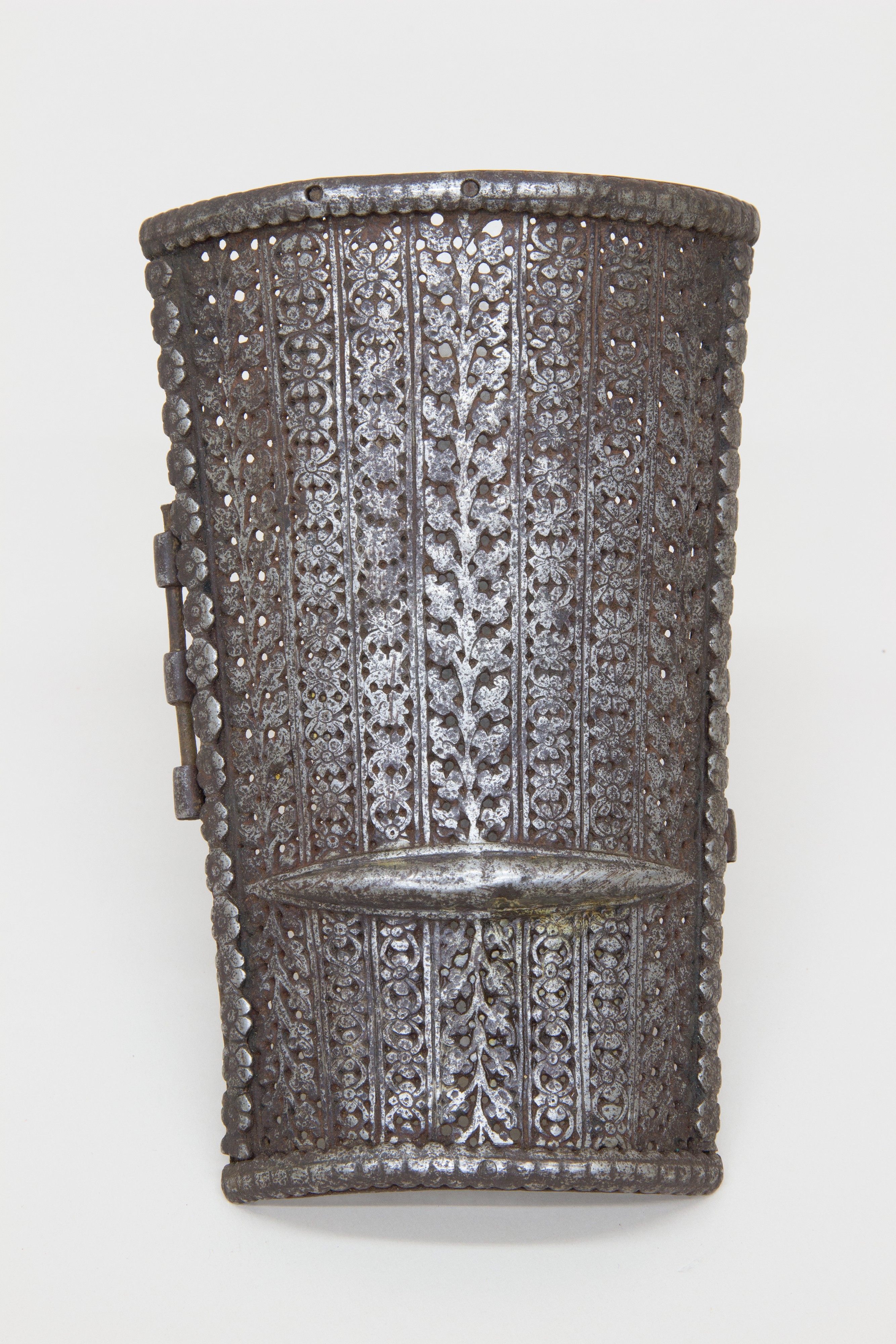 The arm guard "Inside Lame of Arm Guard" by artist unknown, is a gray, metal piece with rounded top and bottom edges. The arm guard is curved to fit around an arm. The surface of the arm guard features a series of vertical lines and ornate designs. The arm guard has a darker gray color on the outside and a lighter gray color on the inside. The edges are decorated with a series of small bumps. There are two small hinges on the left side. The background of the image is white.