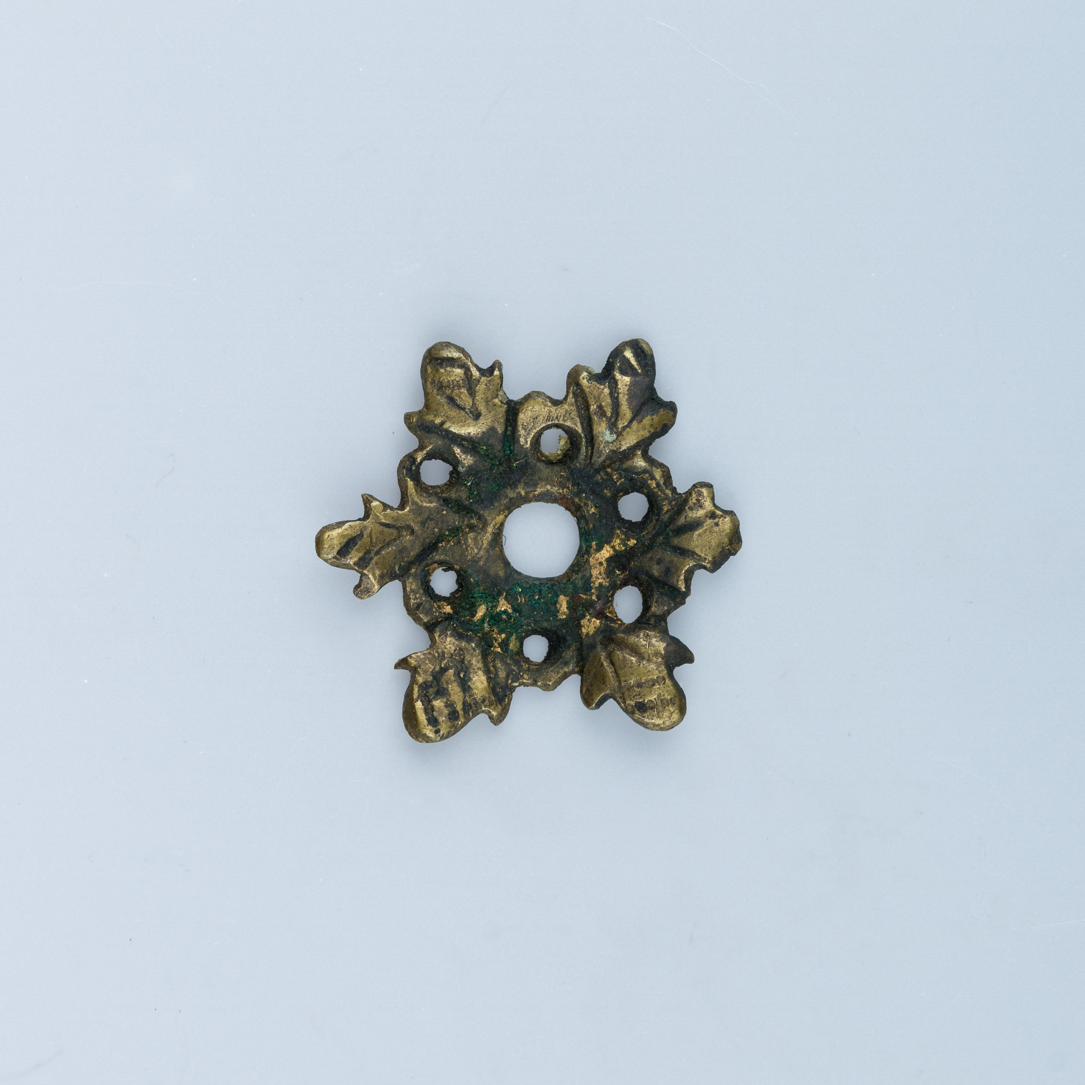 Rosette by unknown artist: A bronze-colored, flower-like object with rounded points around its outer edge. The object has one large circular hole in the center and six smaller circular holes around it. The object has a green patina. The background is light blue-gray.