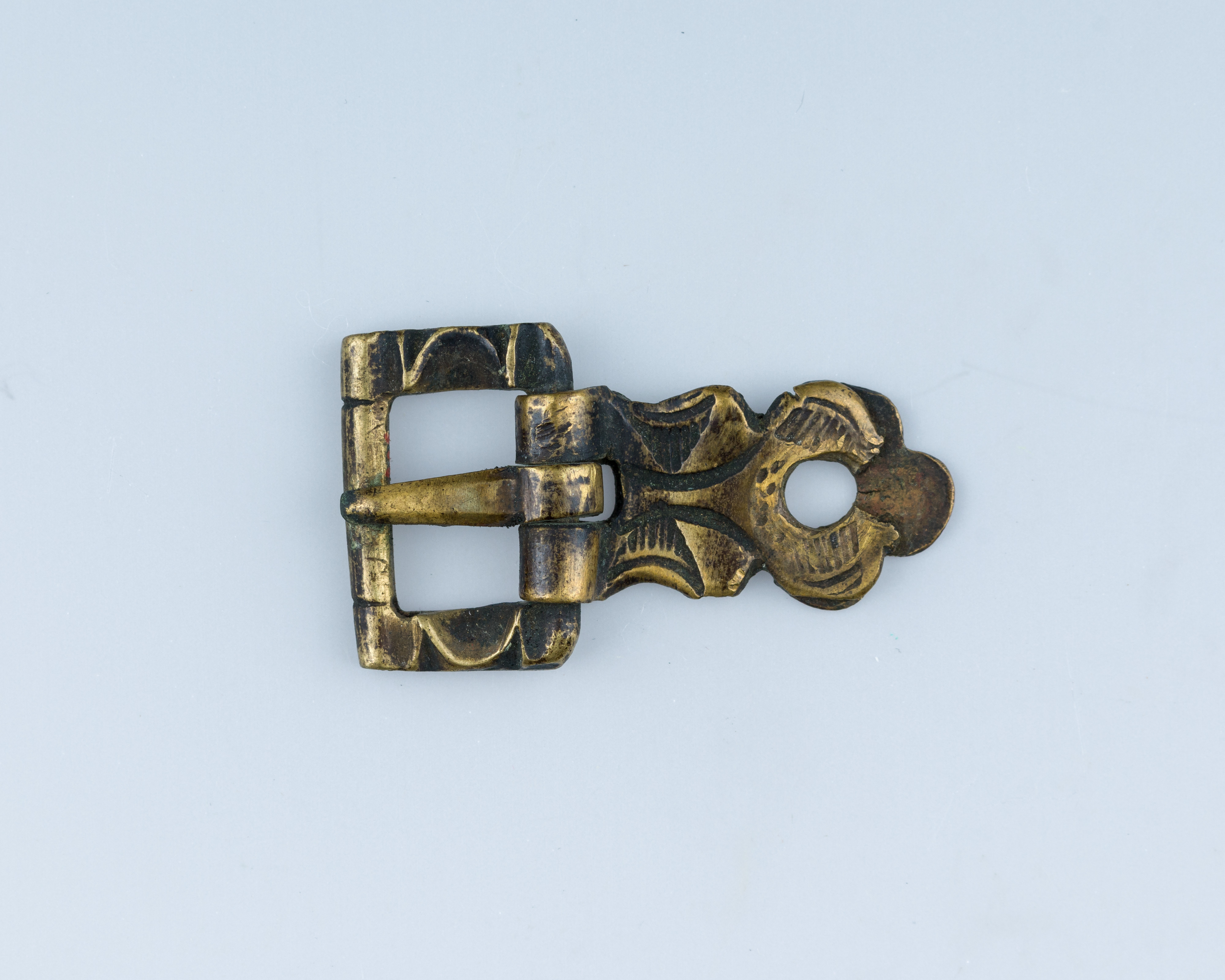 Bronze-colored metal buckle with rectangular pronged frame and ornate circular end featuring a hole; background light blue. Buckle by artist.