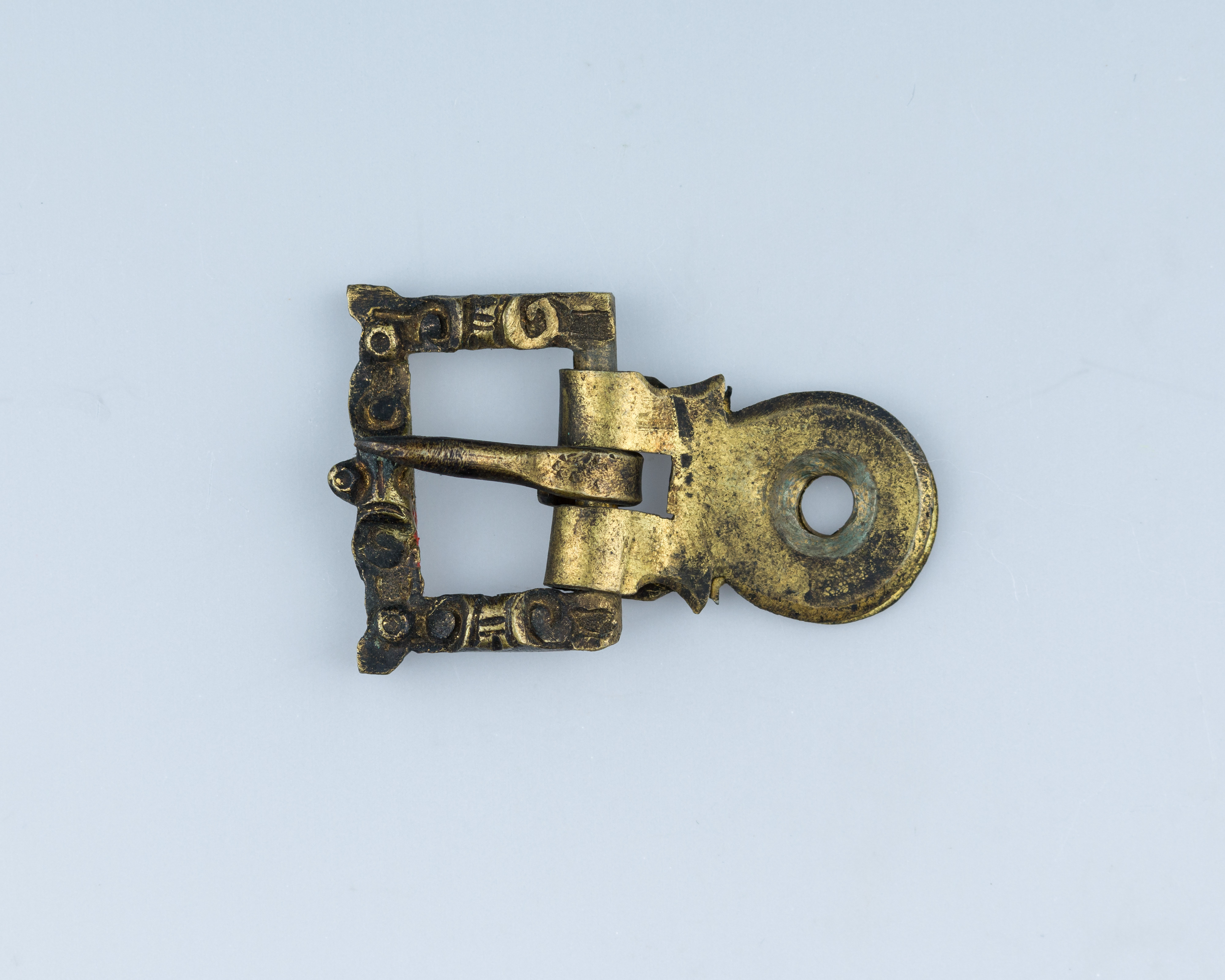 The image shows a small, old, brass-colored buckle. The buckle is rectangular with a circular protrusion on the right side. The rectangular part has a horizontal bar across the middle and a smaller vertical bar on the left side. The buckle has a dark patina and appears to be made of metal. The background is light blue. The buckle is titled "Buckle" and the artist is unknown. Search terms: small, old, brass-colored, rectangular buckle, circular protrusion, horizontal bar, vertical bar, dark patina, metal.
