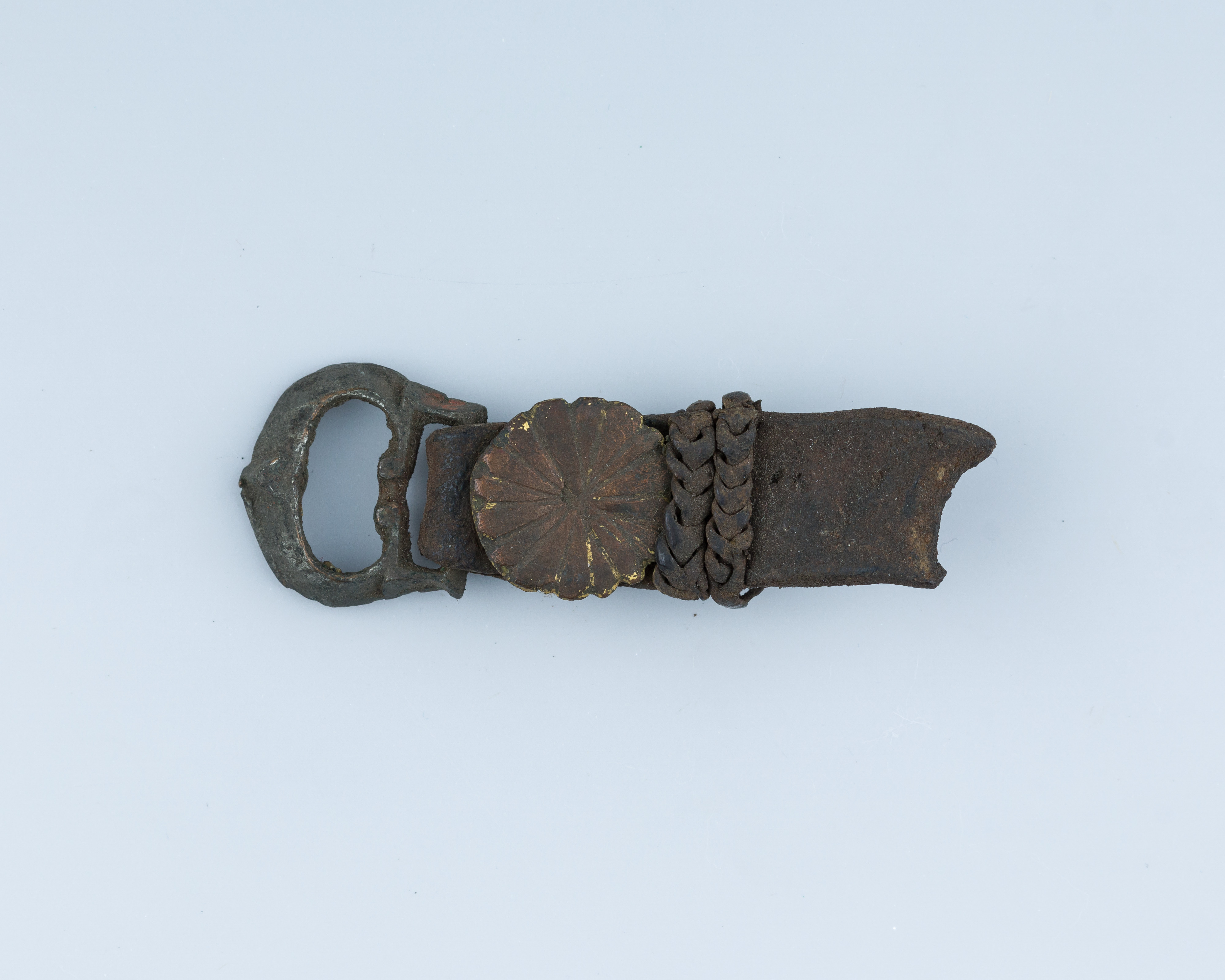 The image shows "Buckle" by an unknown artist. The object is a dark brown, rusted metal buckle. It has a D-shaped ring on the left side. To the right of the ring is a round, flat piece with a flower-like design. The main body of the buckle is a long, thin piece of metal. The buckle has a braided metal band around the middle. The background is light blue with a slight shadow underneath the buckle. The buckle appears to be old and worn. It is positioned horizontally in the center of the image.