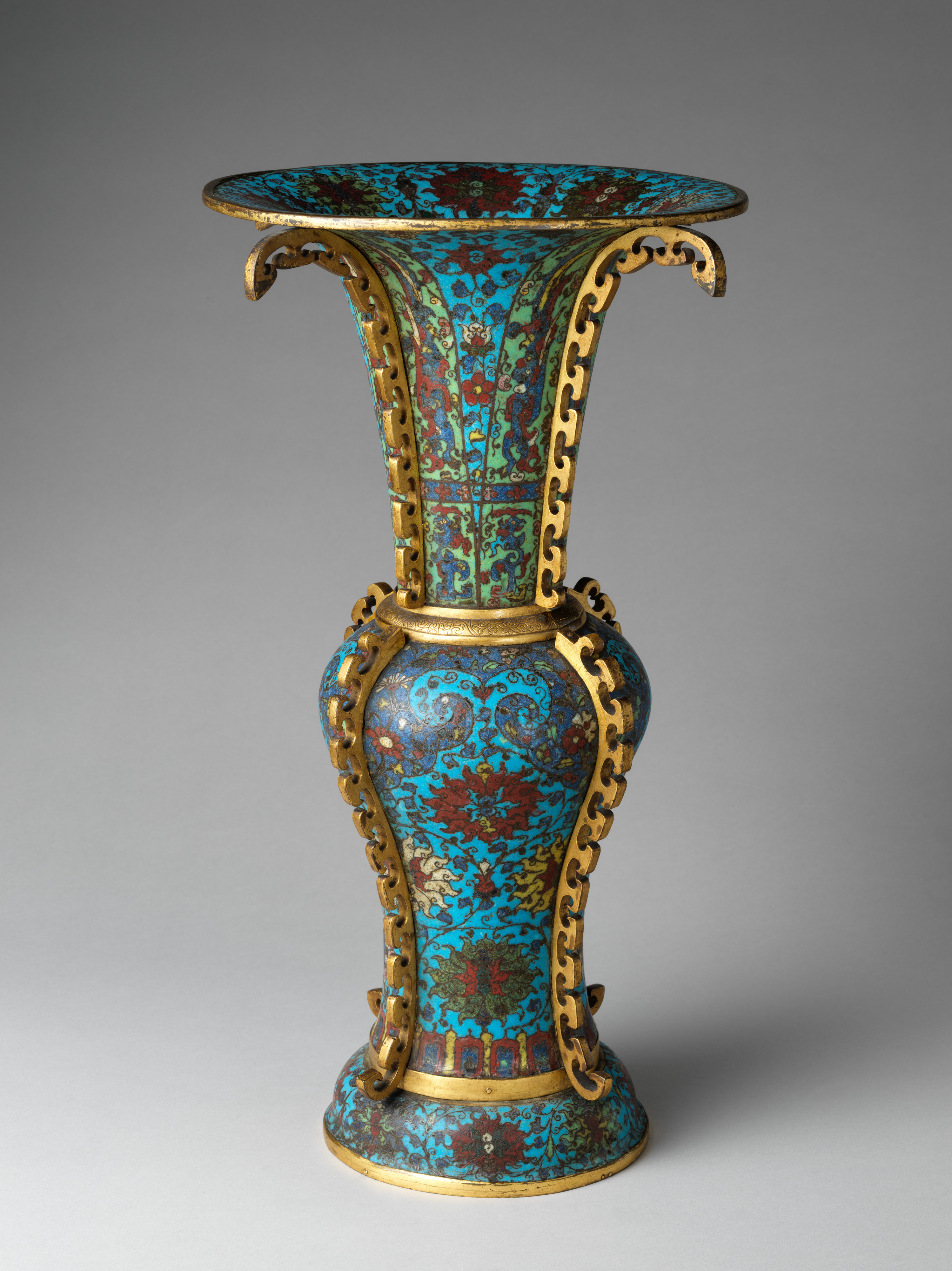 Vase in the form of an archaic wine vessel (gu), by artist unknown. The vase has a wide, flared mouth and a narrow base. The body of the vase is divided into two parts: - The upper part tapers down and is wider at the top. - The lower part is bulbous. The entire vase is decorated with intricate, colorful designs featuring turquoise, red, and green. The design includes gold-colored metalwork with curved chain-like elements on either side that connect the upper and lower sections. The base of the vase is circular and flat. The background of the image is gray, with a shadow cast to the right of the vase.
