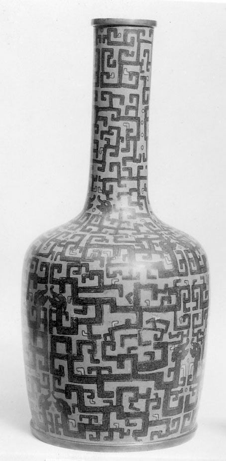 The image shows a black and white photograph of a vase. The vase has a narrow neck and a wide body. The vase is decorated with a maze-like pattern. The pattern consists of interlocking lines that form a maze-like design. The pattern covers the entire surface of the vase. The vase is symmetrical about its vertical axis. The background of the image is white. The image appears to show one of a pair of vases titled "Bottle (one of a pair)" by an artist whose name is not specified.