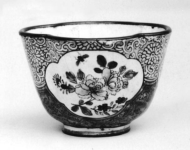 Black and white photograph of Four-Lobed Cup by an unknown artist. The cup has a wide mouth and a narrow base. The exterior is predominantly white and black. The body has a rounded shape with four lobes. The upper section features swirling line patterns and flower designs. A large white four-lobed panel on the body showcases a floral design with leaves and a flying insect. The lower section exhibits an abstract patterned design. The interior is plain white. The cup sits on a white background with a visible shadow underneath.