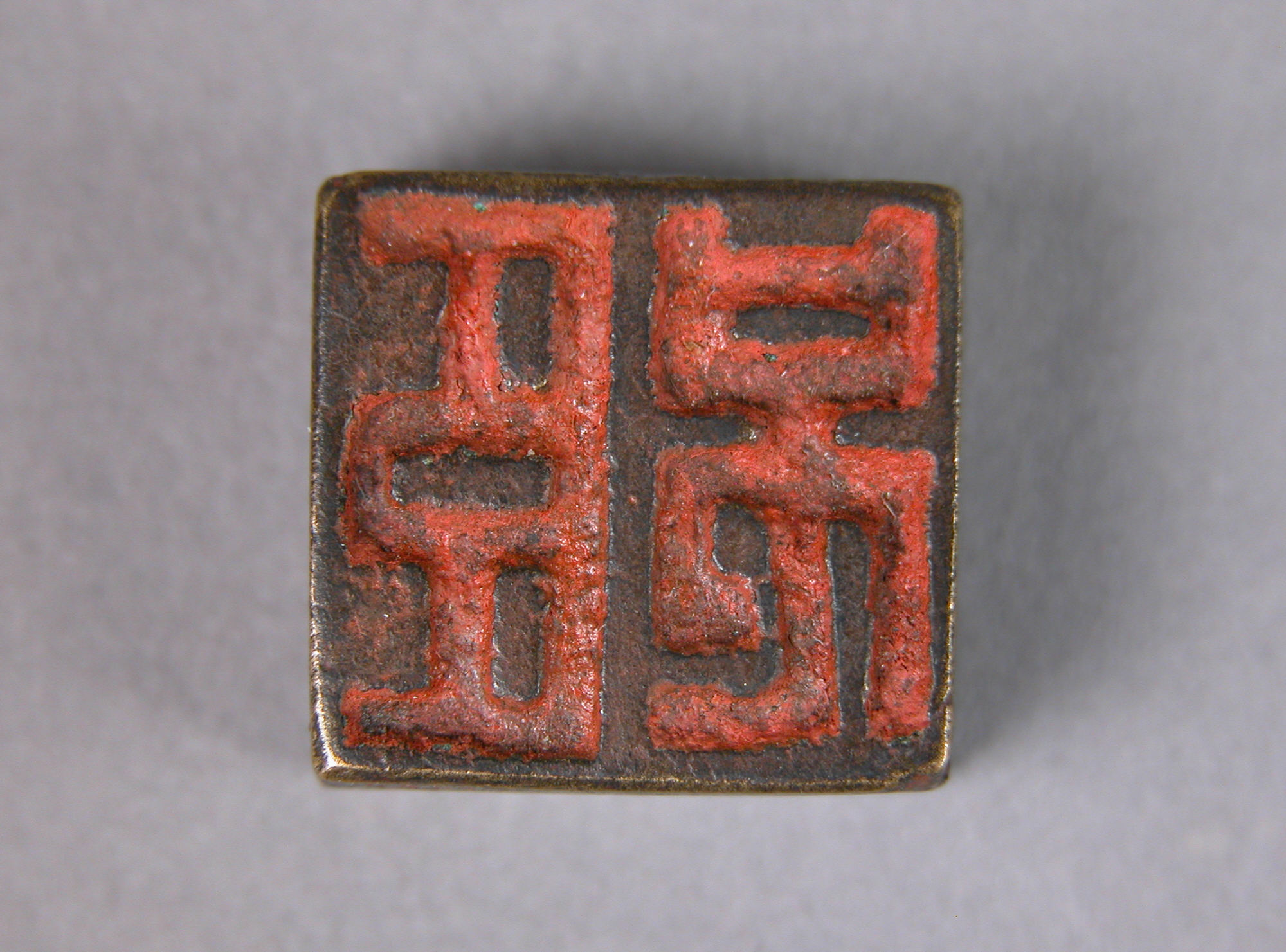 The image shows a square-shaped object, likely a seal. The object is made of dark-colored material, possibly metal, with a reddish-brown design on top. The reddish-brown design consists of four Chinese characters arranged in two rows of two characters each. The characters are carved into the material and filled with a reddish-brown substance, possibly ink or paint. The object has a flat top and straight edges, with a slight shadow visible underneath it. The background of the image is a plain gray color. The seal is associated with Seal.