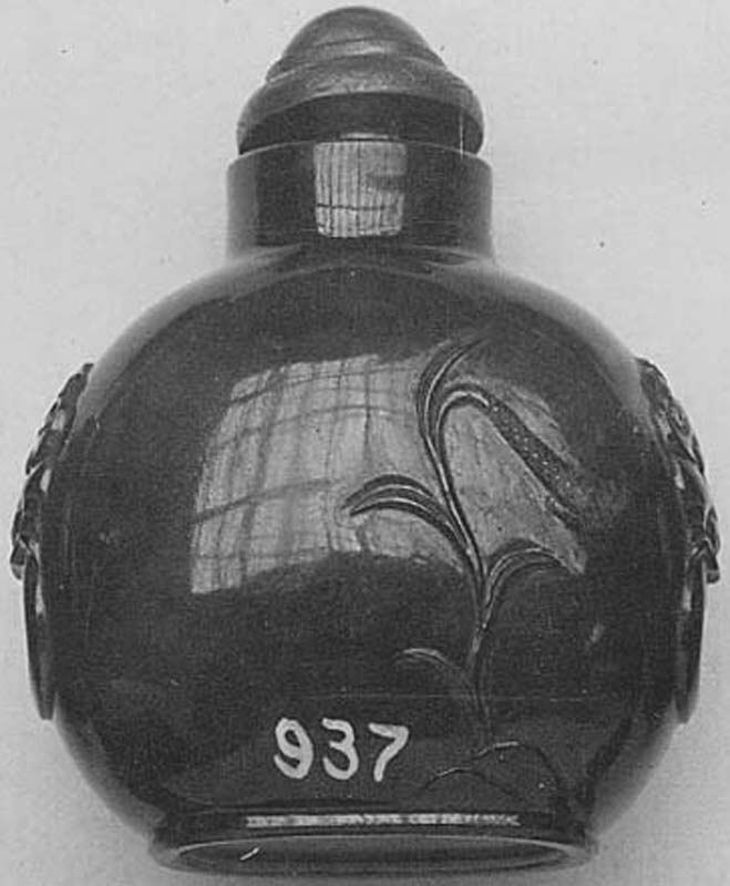 Black snuff bottle with stopper; rounded body; design of stylized leaf on side; two loop handles; number 937 on bottom; stopper rounded, ridged. Artist: Unknown. Title: Snuff bottle with stopper.