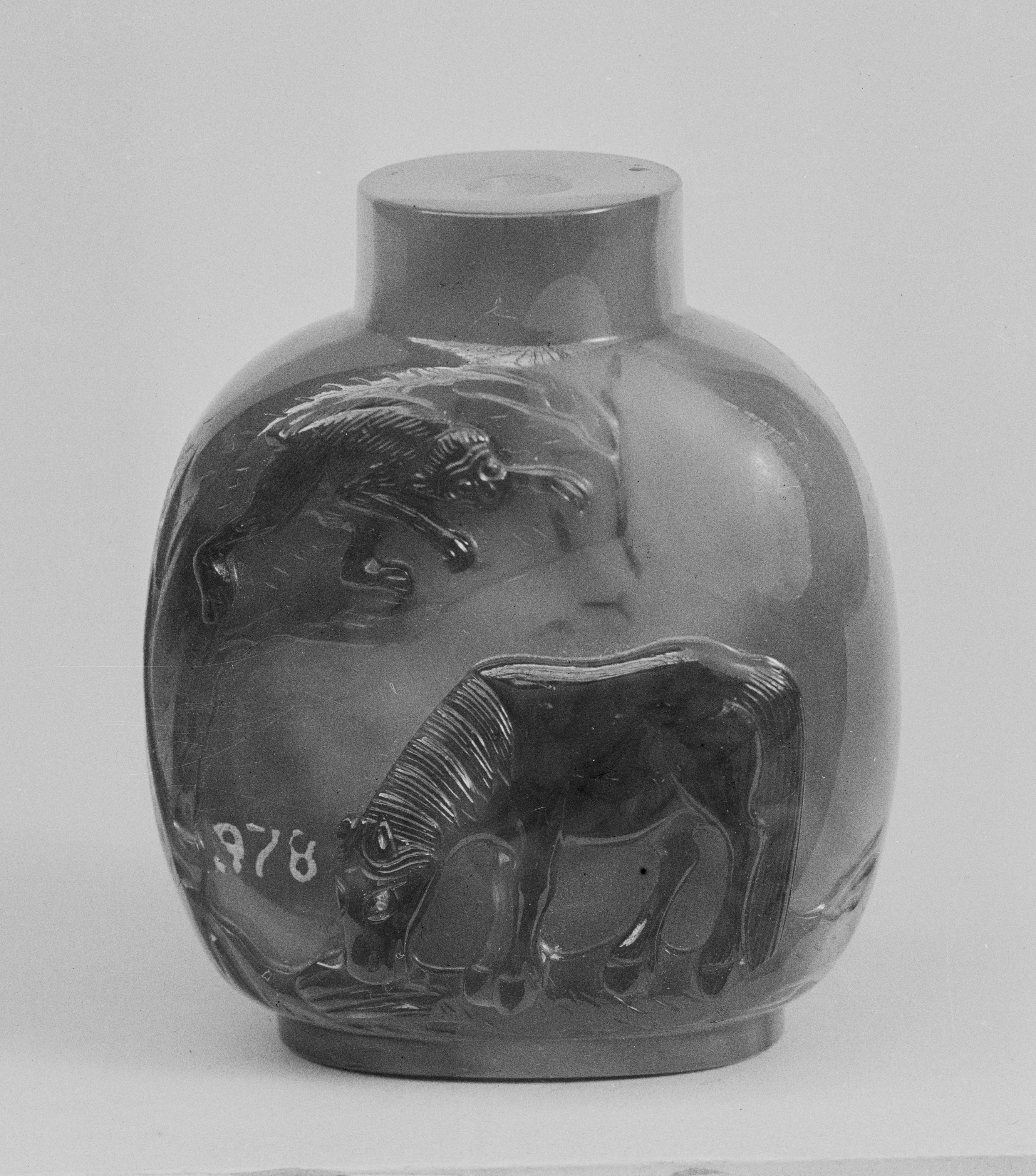 Dark-colored snuff bottle with a cylindrical neck. The body of the bottle is rounded and bulbous. Two relief carvings of animals are on the front. One animal appears to be a horse-like creature with a long snout. The other appears to be a winged creature. A number etched into the lower left side. The background is light-colored. Title: Snuff Bottle. Artist: Unknown.