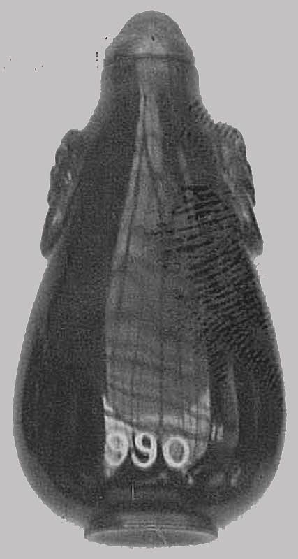Snuff bottle with stopper by unknown artist. The object is a dark-colored, rounded bottle with a narrow neck and a small opening at the top. The bottle has a stopper on top. Two protrusions are on either side of the body. The body of the bottle tapers in at the top and bottom. The bottom of the bottle appears to have a flat base. The numbers "990" are on the bottom. The image is in grayscale. The background is solid light grey.