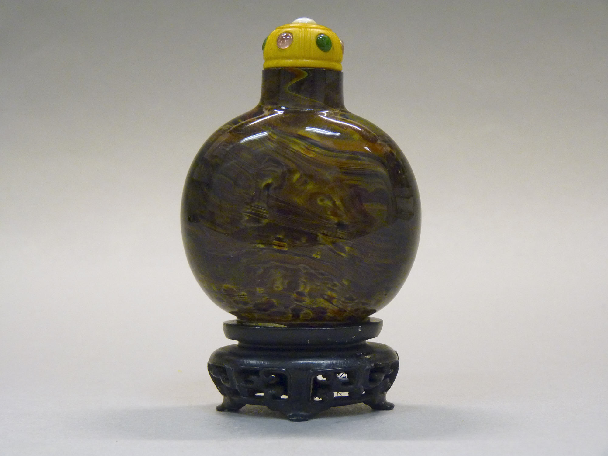 The Snuff Bottle by an unknown artist is a dark brown glass bottle with a marbled appearance. The bottle is bulbous in shape, with a short neck. A yellow stopper with two small gemstones, one clear and one green, is on top. The bottle sits on a black stand with a decorative base and three feet. The background is a gradient from light gray to dark gray.