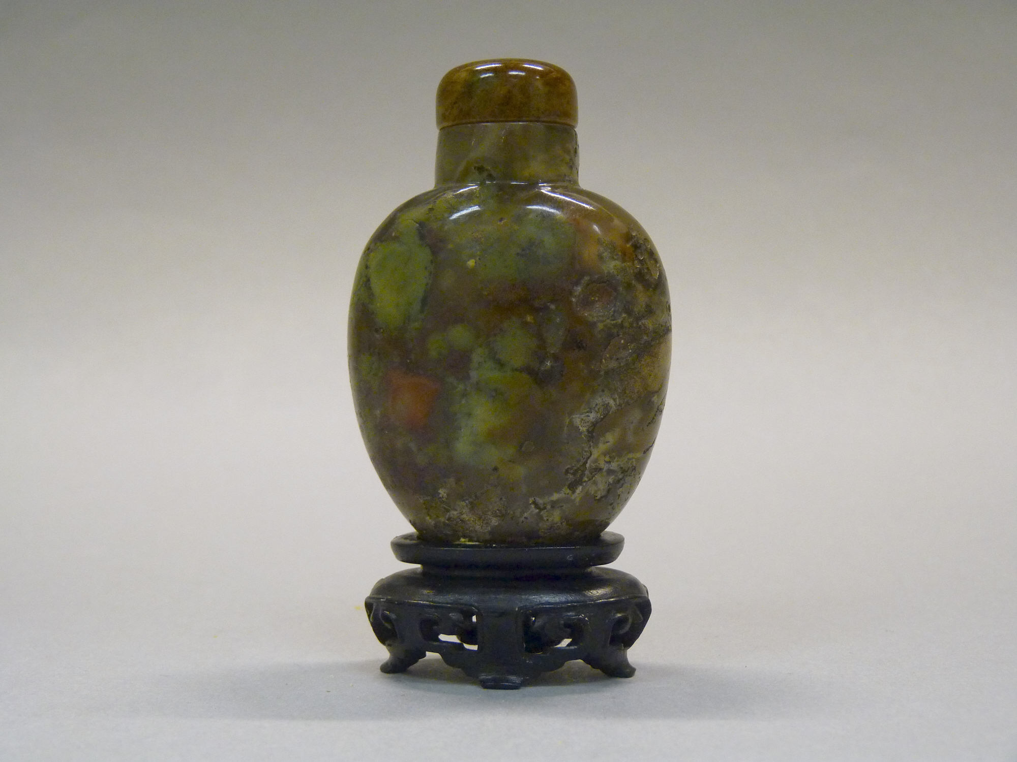 The Snuff Bottle by an unknown artist is an object with a rounded body and a short neck ending in a small, circular mouth. The body of the bottle is made of a mottled green, brown, and orange stone. The bottle has a glossy finish. It is sitting on a small, black stand with three legs and an ornate design around the middle. The stopper is rounded and made of a lighter brown stone. The background is a plain white surface with a slight shadow cast by the bottle and stand.