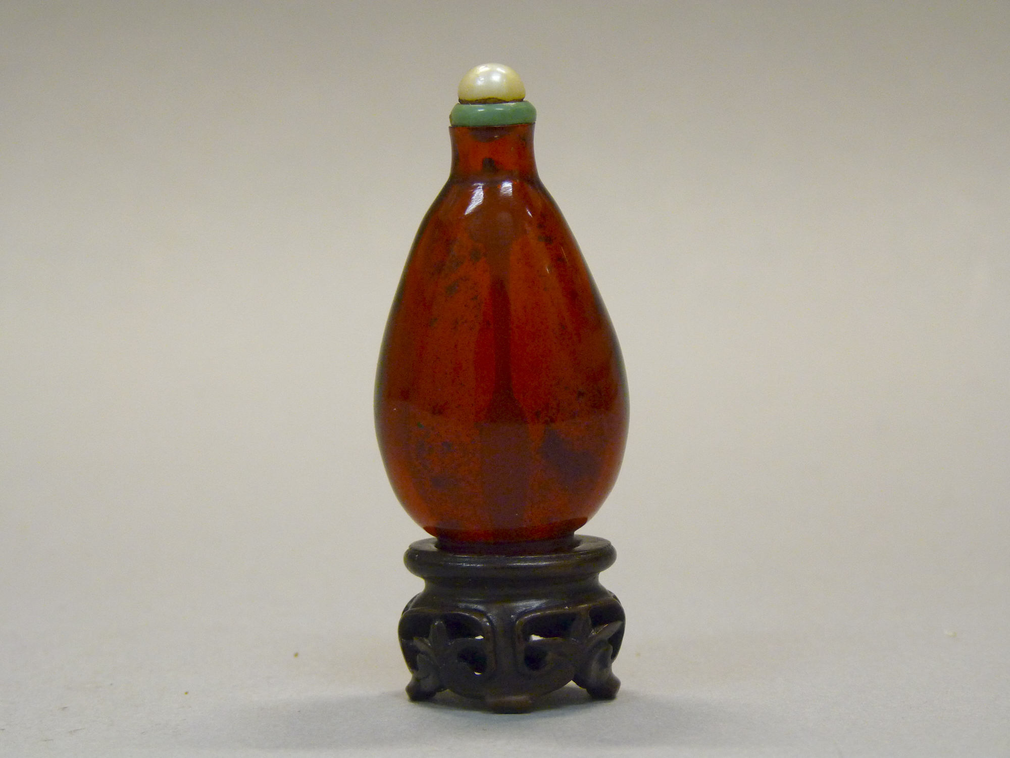 Snuff Bottle by. Brown pear-shaped body with dark brown speckles, glossy surface; green and white stopper. The stopper is white on top, green on bottom. The base is black with curved legs; three on each side. The background is beige. The bottle stands on a beige surface.