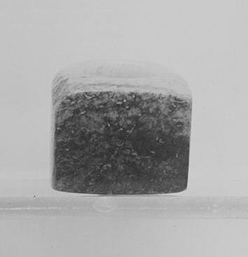 The Archer's ring by Kostas Papakostas is rounded rectangular in shape. The ring is made of dark-colored stone with white specks. A lightly colored stone tops the ring with rounded edges. The stone appears to have a rough texture. The background is light-colored and featureless.