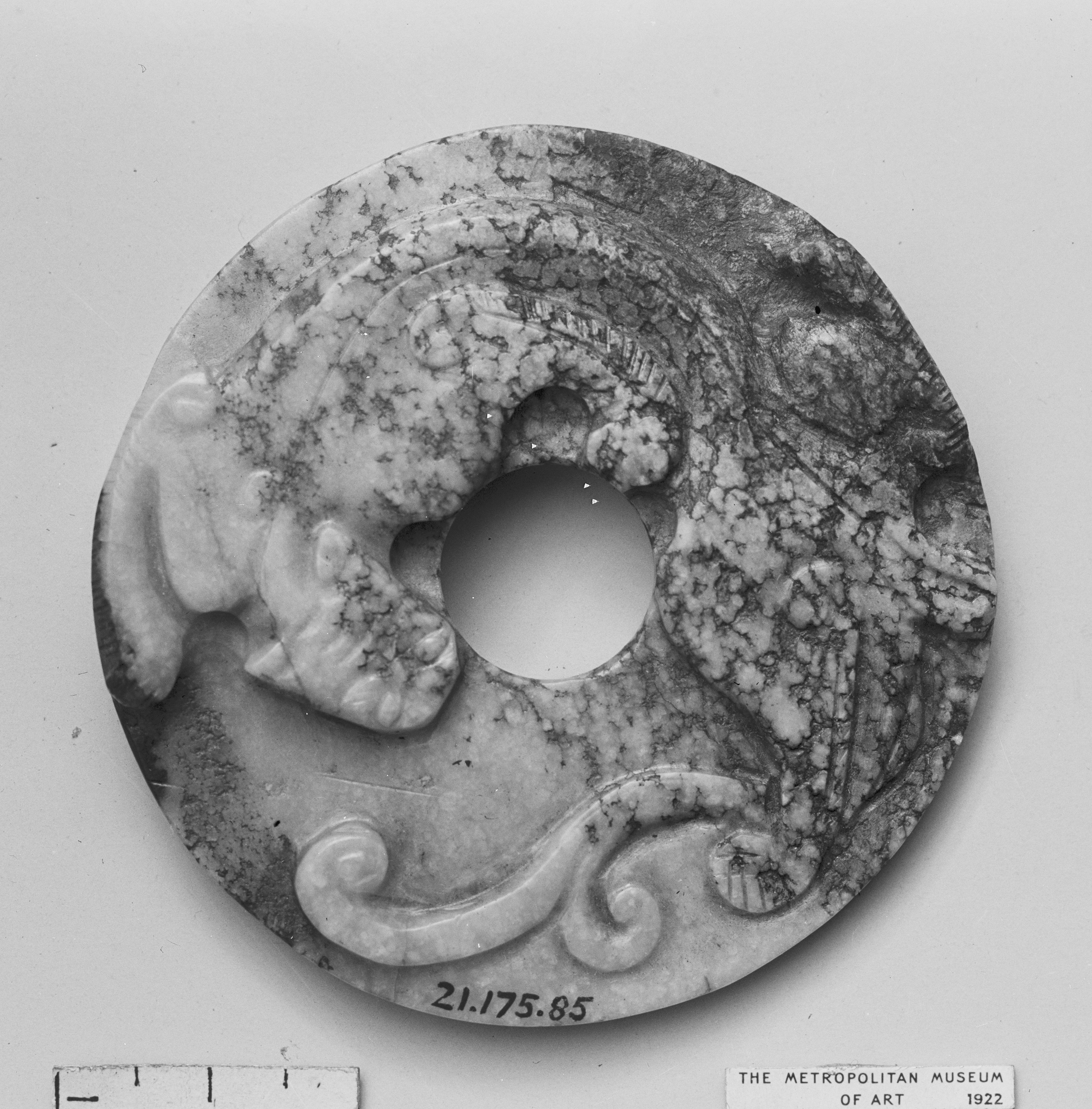The object is a circular disk made of stone with a hole in the center. The disk is gray and white with darker gray marbling. The disk has a carved design featuring two dragons, one on the left and one on the right. The dragon on the left faces right and has its mouth open, while the dragon on the right faces left with its mouth closed. Both dragons have five claws on the visible side. The bottom of the disk features a carved wave-like design. The numbers "21.175.85" are engraved at the bottom. The background is light grey. A ruler is visible at the bottom left. The disk titled "Disk" is by an unknown artist.