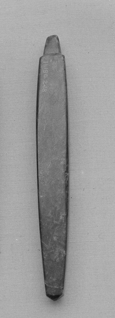 Dark gray stone pendant, long and narrow, tapering to points at both ends, one end more sharply pointed than the other. The stone is smooth with some visible texture and light scratches. A small inscription is etched vertically along the left side. The background is light gray.
