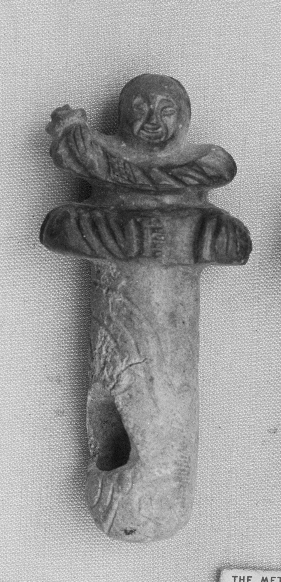 Finial with child by Unknown. The image shows a black-and-white close-up photograph of a small, stone or metal object. The object features a rounded top with a carved face and arms. The face appears to have a smile. The arms are bent, and one hand holds an indistinguishable object. The top part of the object is rounded and has a decorative edge. A cylindrical section follows, featuring an indistinguishable design and a hole in the center. The background is a light-colored fabric or paper with a visible texture. A small, partially visible white rectangle with black text appears in the bottom-right corner.