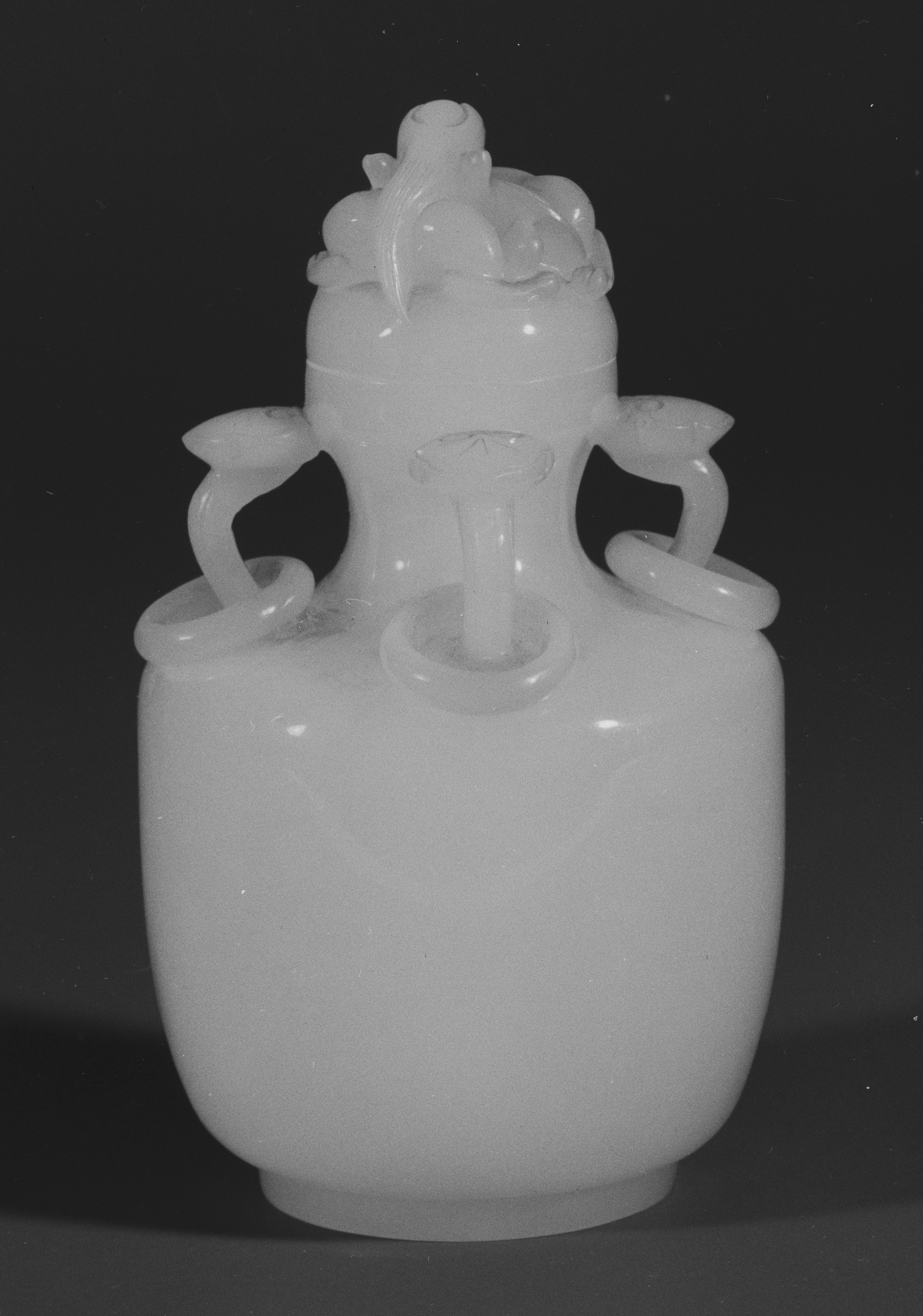 The Covered vase by an unknown artist depicts a white vase with a lid on top. The vase has a rounded body that tapers slightly at the base and two handles on either side that curve upwards. The lid features a decorative design on top. The background of the image is dark.