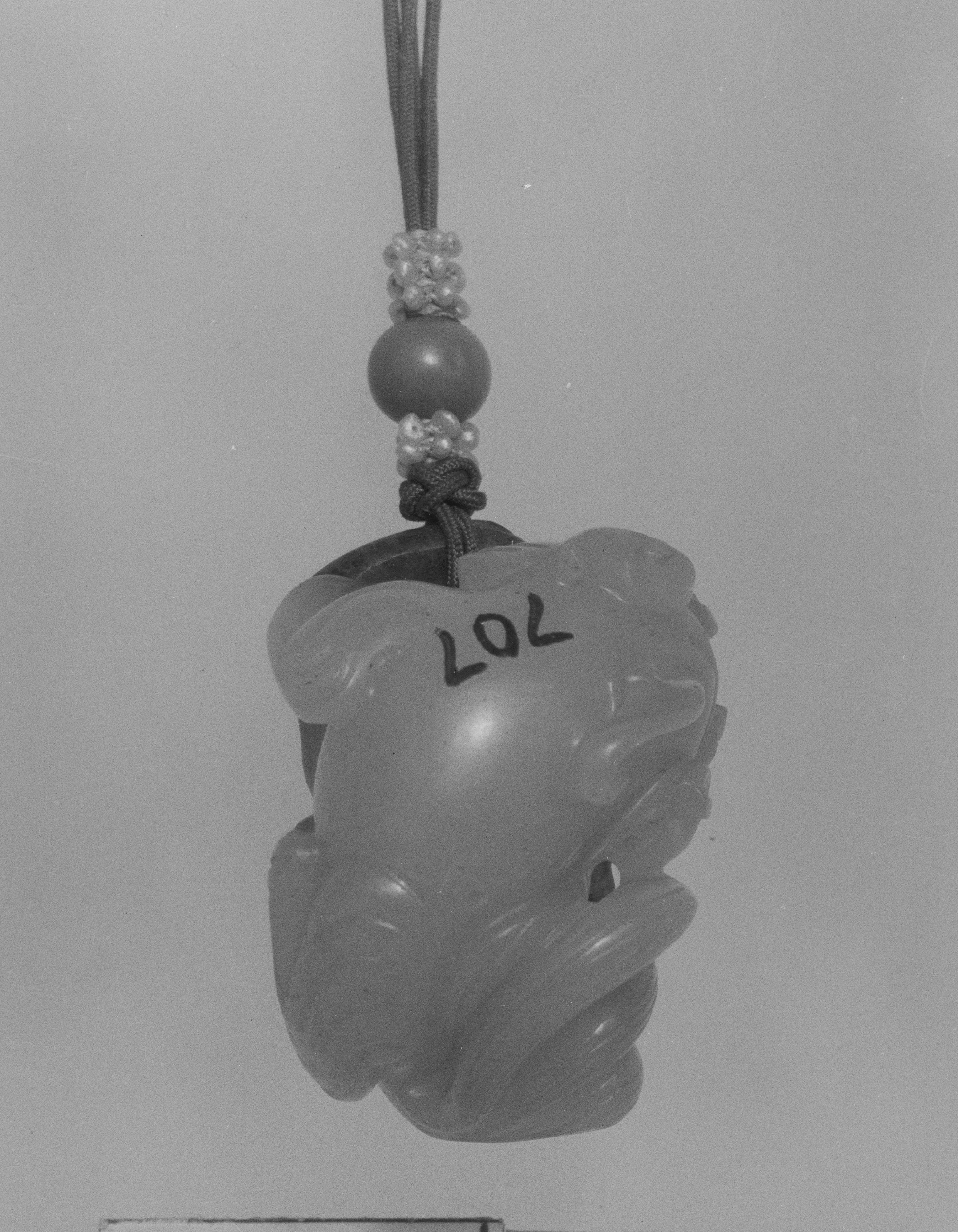 The pendant by an unknown artist titled "Pendant" features a carved stone or jade object resembling a mythical creature, likely a pig or a mythical hybrid, with a large, smooth body and a smaller snout; it has the numbers '102' inscribed on top. The object has a hole through its top and is attached to a cord with a large bead and smaller clear beads above it. The cord extends upwards, out of frame. The pendant appears to be made of a light-colored stone, possibly jade, and has a glossy finish. The background of the image is a plain light grey color.
