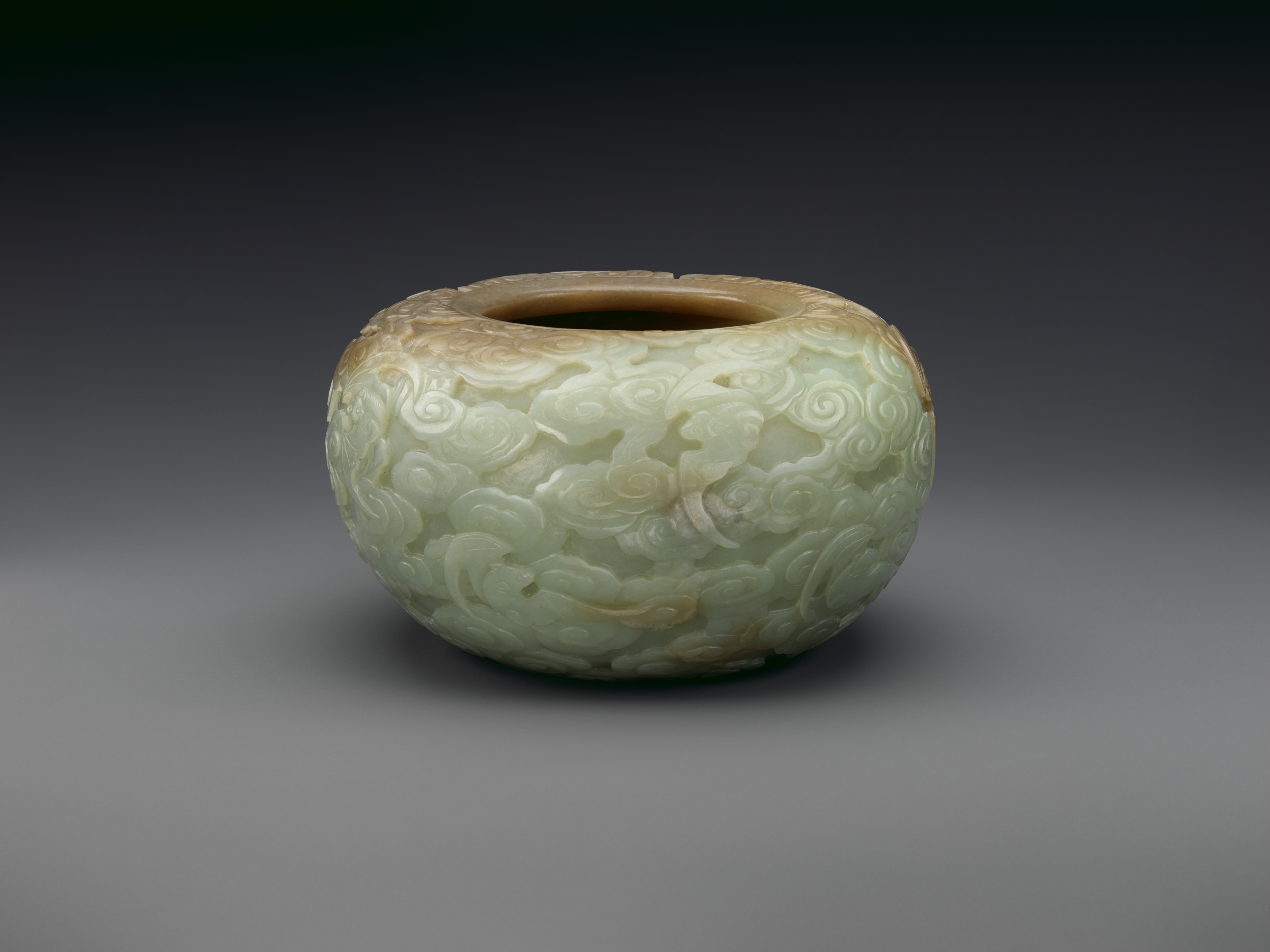 Pale green jade bowl, artist unknown, titled "Bowl". Round body with wide mouth and flat bottom. Exterior surface carved with intricate design of swirling clouds and foliage. Light brown discoloration around rim. Object centered on gray gradient background.