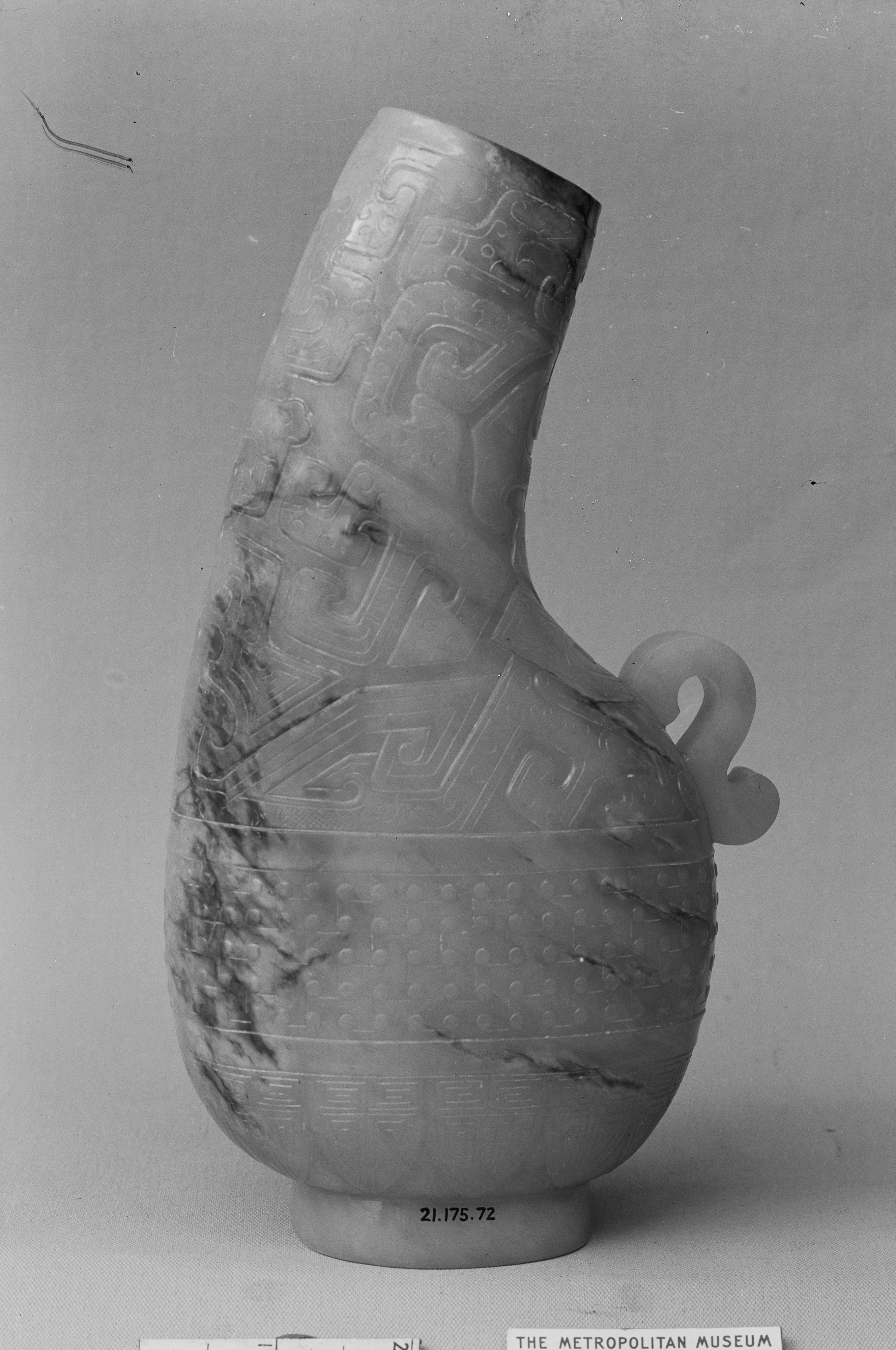 The Vase by Unknown Artist shows a gray stone vase with a wide body and a narrow neck. The vase has a handle on the right side. The body of the vase is decorated with various carved patterns, including lines, shapes, and textures. The vase has a small base and appears to be made of a smooth, possibly marble-like material. The background of the image is a plain light grey color, suggesting that it may be a museum or gallery setting. A small label on the bottom reads "THE METROPOLITAN MUSEUM".