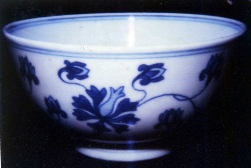 White bowl with blue floral design. The bowl has rounded shape and two horizontal blue lines around the rim. A blue floral pattern encircles the bowl's body, featuring large flower with many rounded petals at center, surrounded by smaller flowers and leaves connected by curved stems. The bowl's base is small and circular. The background is black. Bowl by unknown artist.