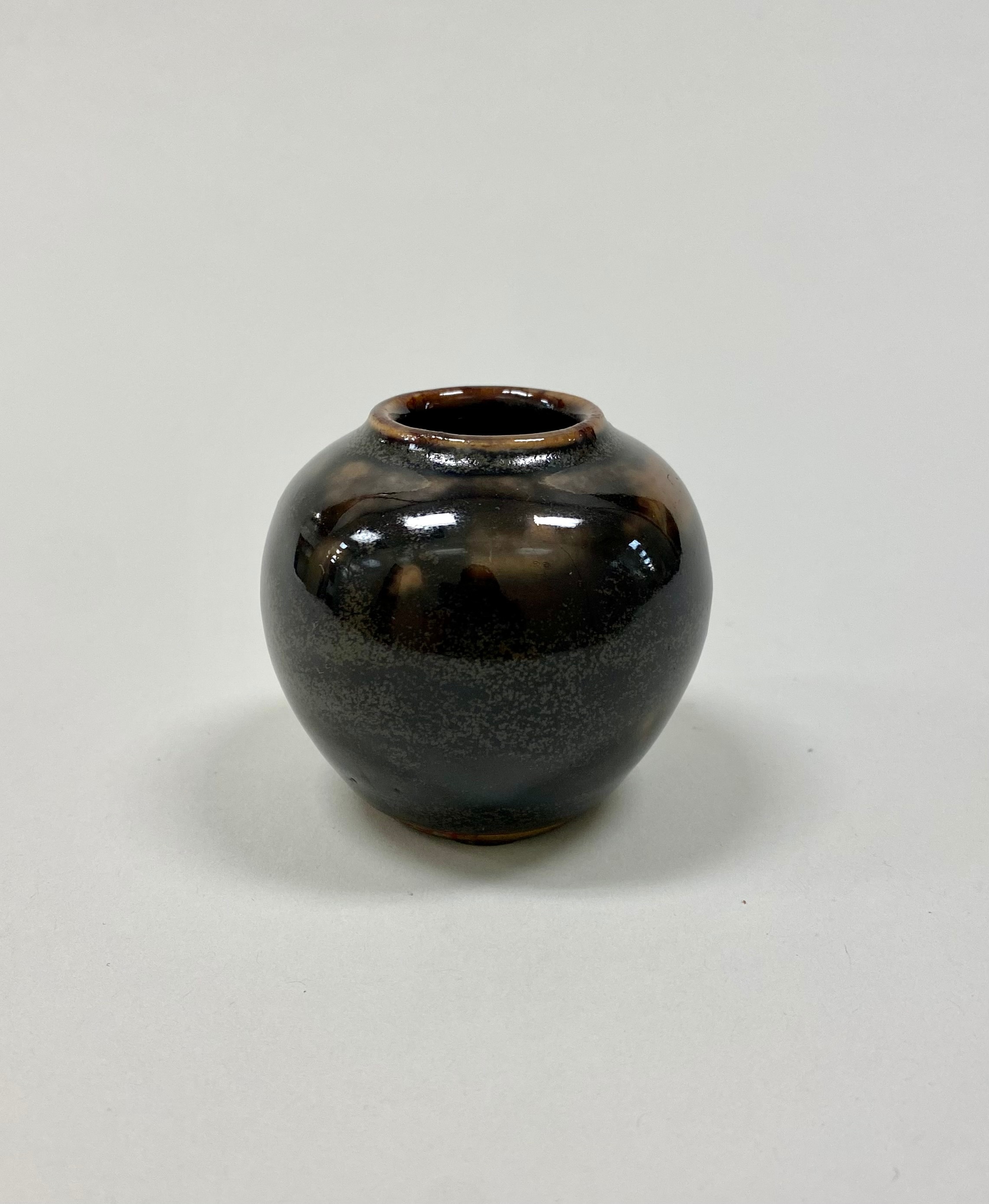 The image shows a miniature jar by an unidentified artist titled "Miniature jar". The jar is dark brown with a glossy glaze. The jar has a wide, rounded body that is roughly spherical in shape. The opening at the top is circular and relatively small compared to the body of the jar. The base of the jar is flat and small. The background is plain white with a subtle shadow cast by the jar.
