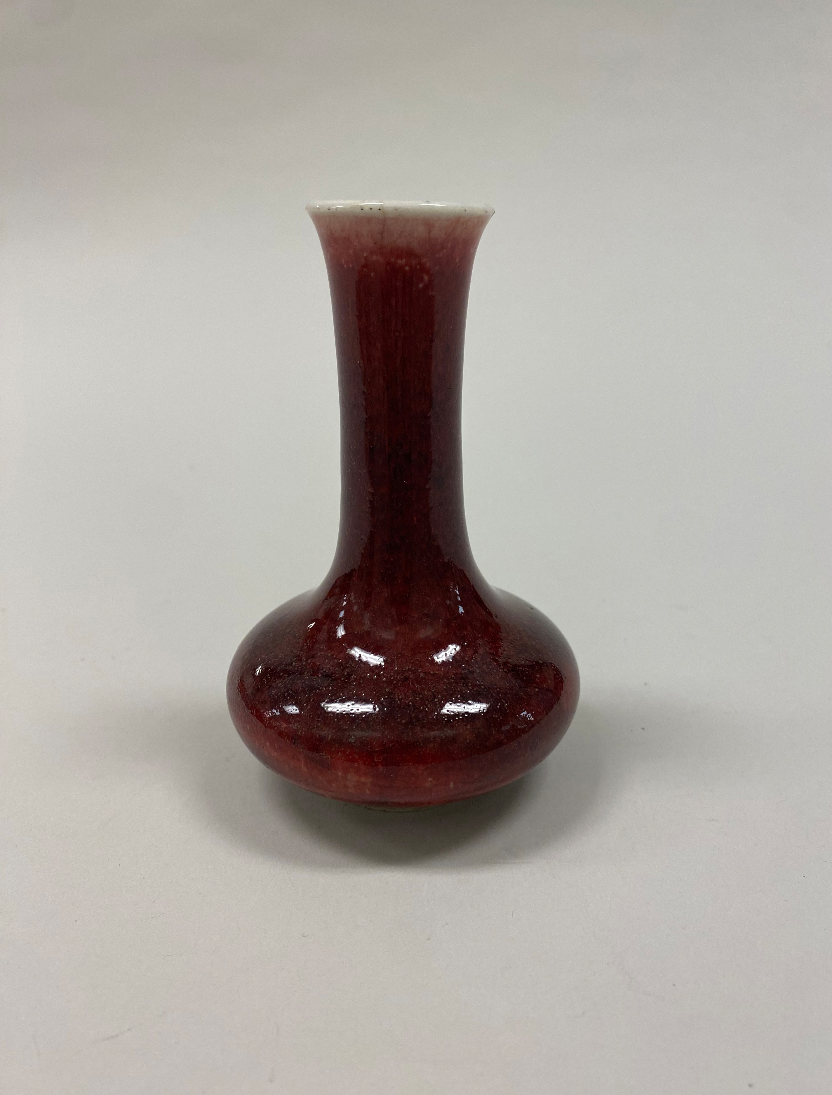 Miniature vase by artist not specified. The vase is dark red with a glossy finish. The vase has a bulbous body that is rounded at the bottom and narrows towards the top. The neck of the vase is long and thin. The mouth is flared and white around the rim. The vase casts a shadow on a plain white surface.