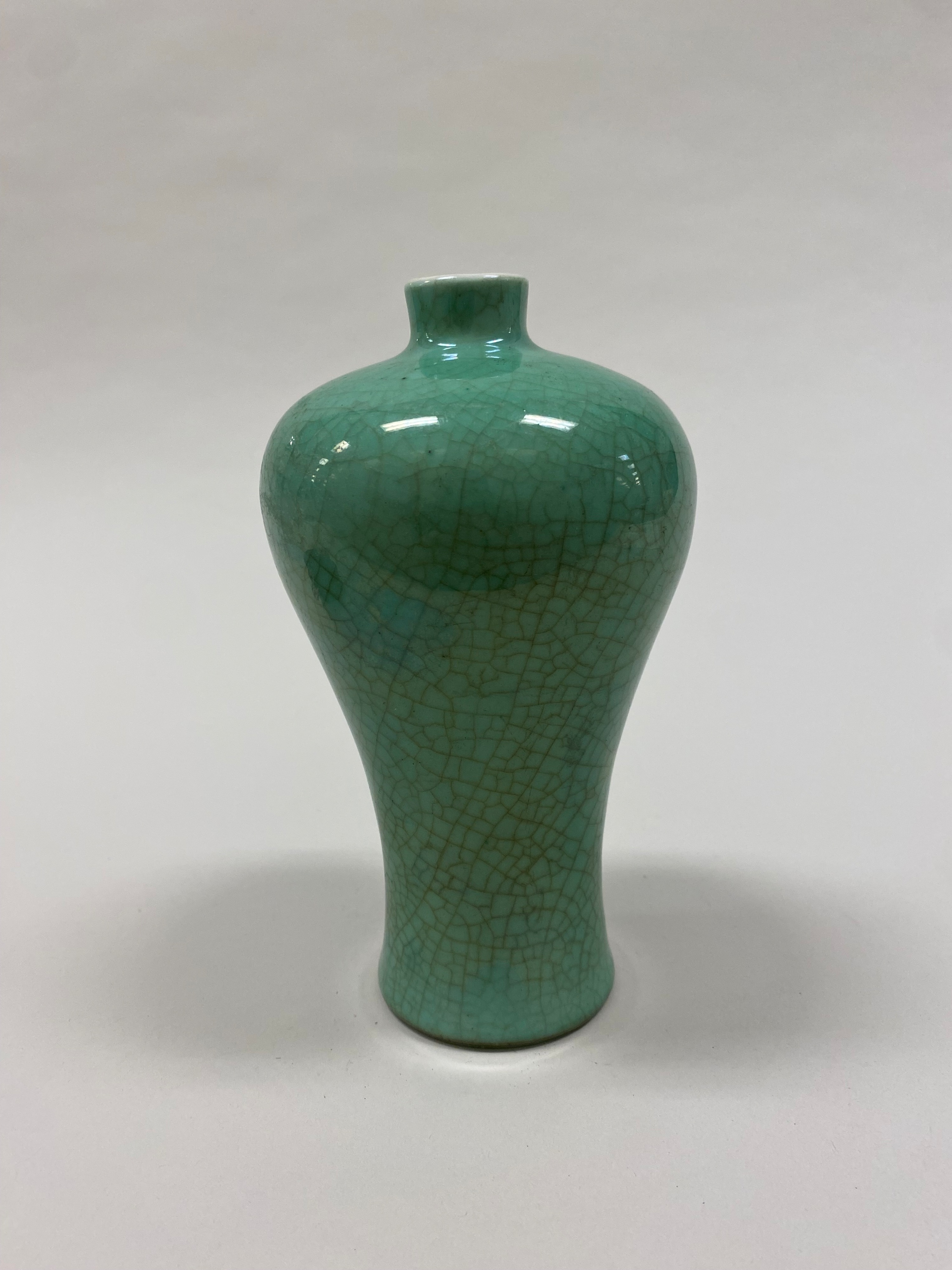 The Meiping vase by unknown artist is a green ceramic vase. The vase has a narrow neck and a wide body that tapers towards the base. The vase is symmetrical. The body of the vase is covered in a cracked glaze that is a uniform green color. The glaze is shiny and reflects light, with several small highlights visible on the upper portion. The vase stands on a circular base. The background is a plain light gray color, with a shadow cast by the vase.