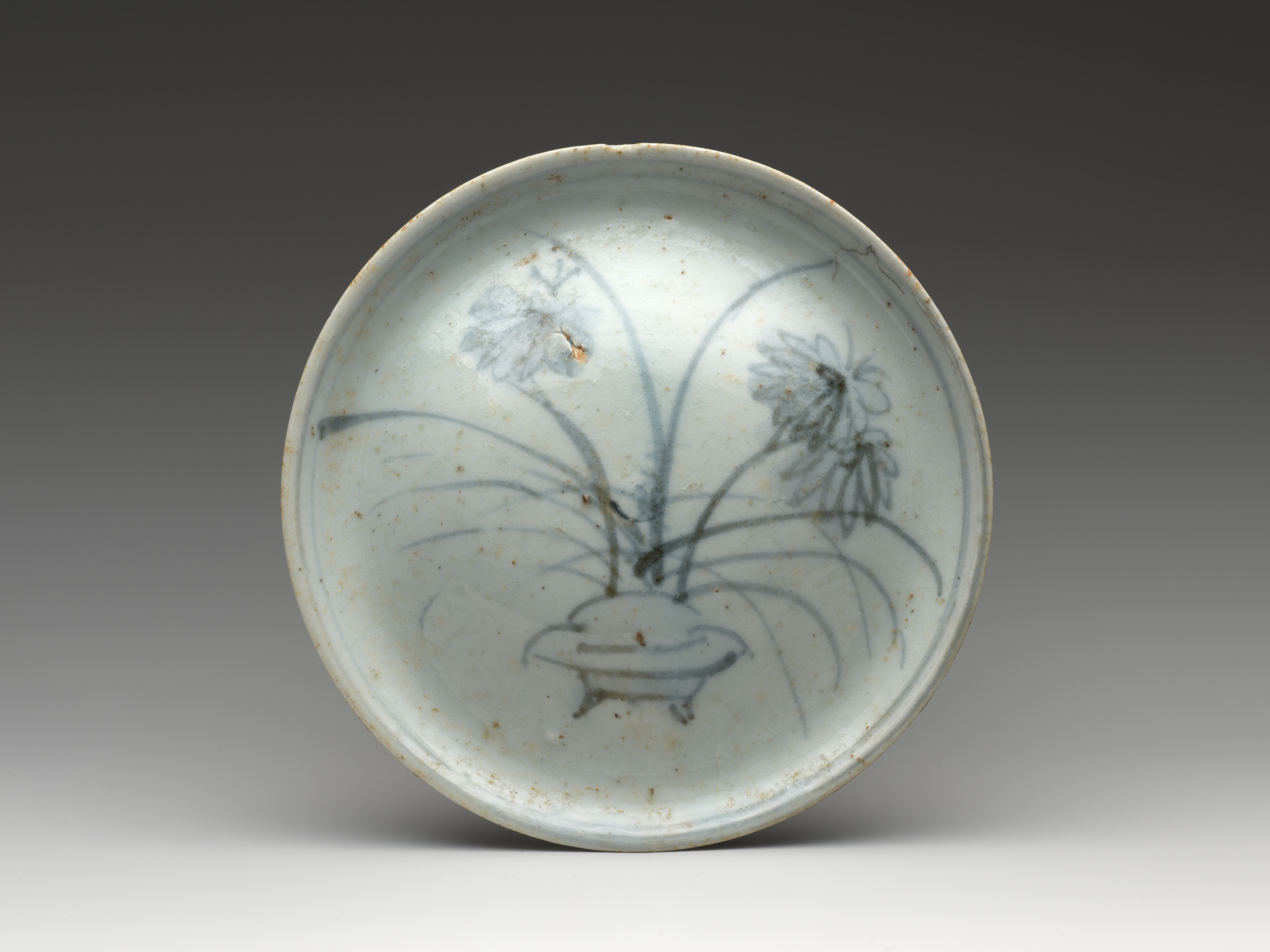 Small dish, round shape. Light blue-green glaze on body. Interior of dish features dark blue underglaze decoration of flower arrangement in a pot. Pot has three legs. Long stems with leaves and two flowers extend from pot. One flower on left side higher than flower on right. Background of image is dark gray to light grey gradient, with dish casting a shadow on light surface.