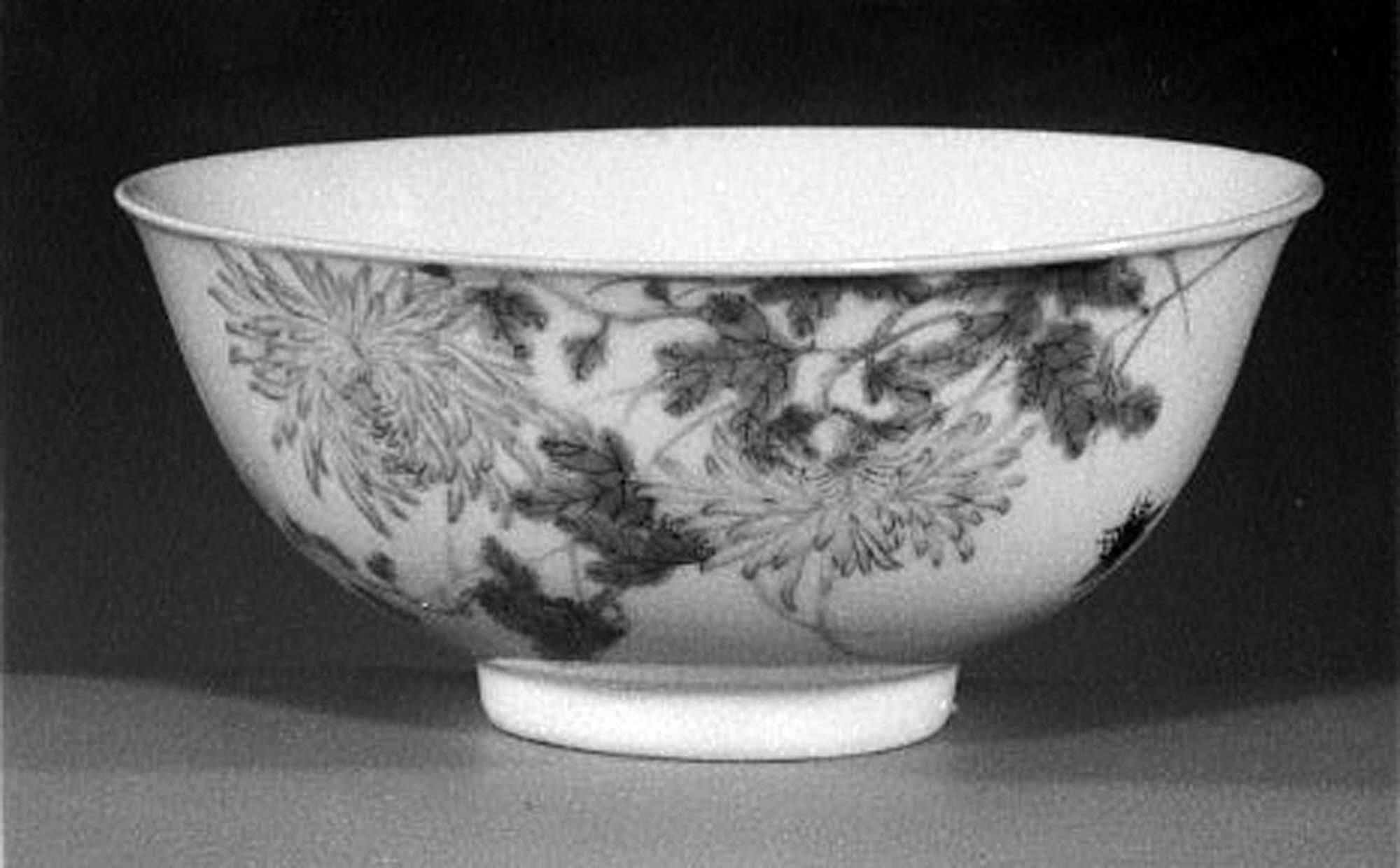 The bowl by an unknown artist titled 'Bowl' depicts a white porcelain bowl with a wide mouth and a narrow base. The exterior of the bowl features a dark floral design on a light background. The bowl's interior is plain white. It sits on a surface against a dark background.