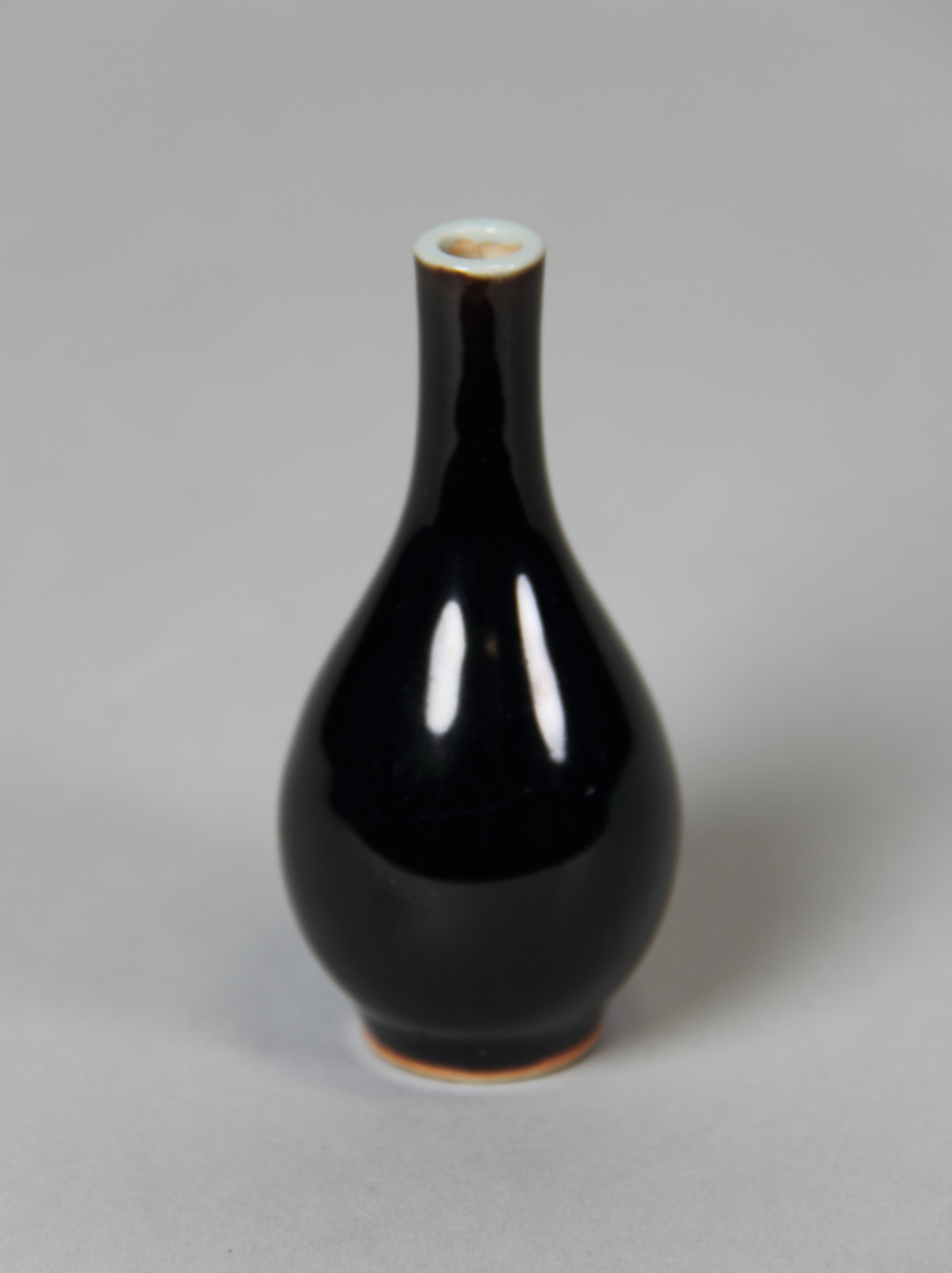 The Vase by artist unknown is black with a narrow neck and rounded body. The vase has a glossy finish. The base of the vase is a light brown color. The opening at the top has a white rim with a small amount of light brown showing. The background is light grey. A shadow is cast to the right of the vase.