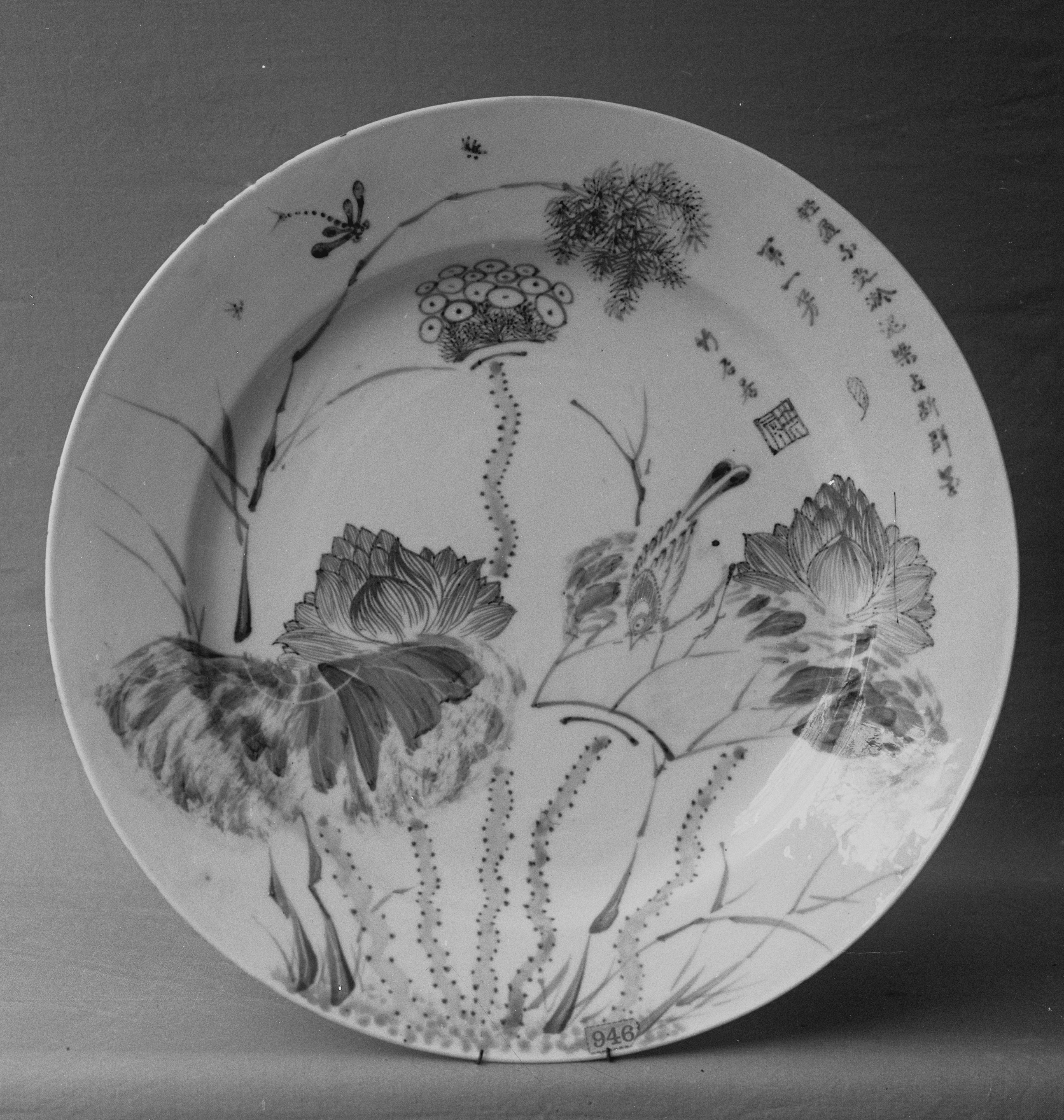 The Plate by an unknown artist depicts a round, white plate with a wide rim and a flat base. The plate features a black and white design consisting of two large flowers with many petals, and several stems with leaves. There are also some Chinese characters written in black on the right side of the plate, near the rim. The plate appears to be made of ceramic or porcelain material. It has a glossy finish and is placed on a dark surface, with a light source coming from the left side. The overall appearance of the plate suggests that it may be an antique or vintage item.