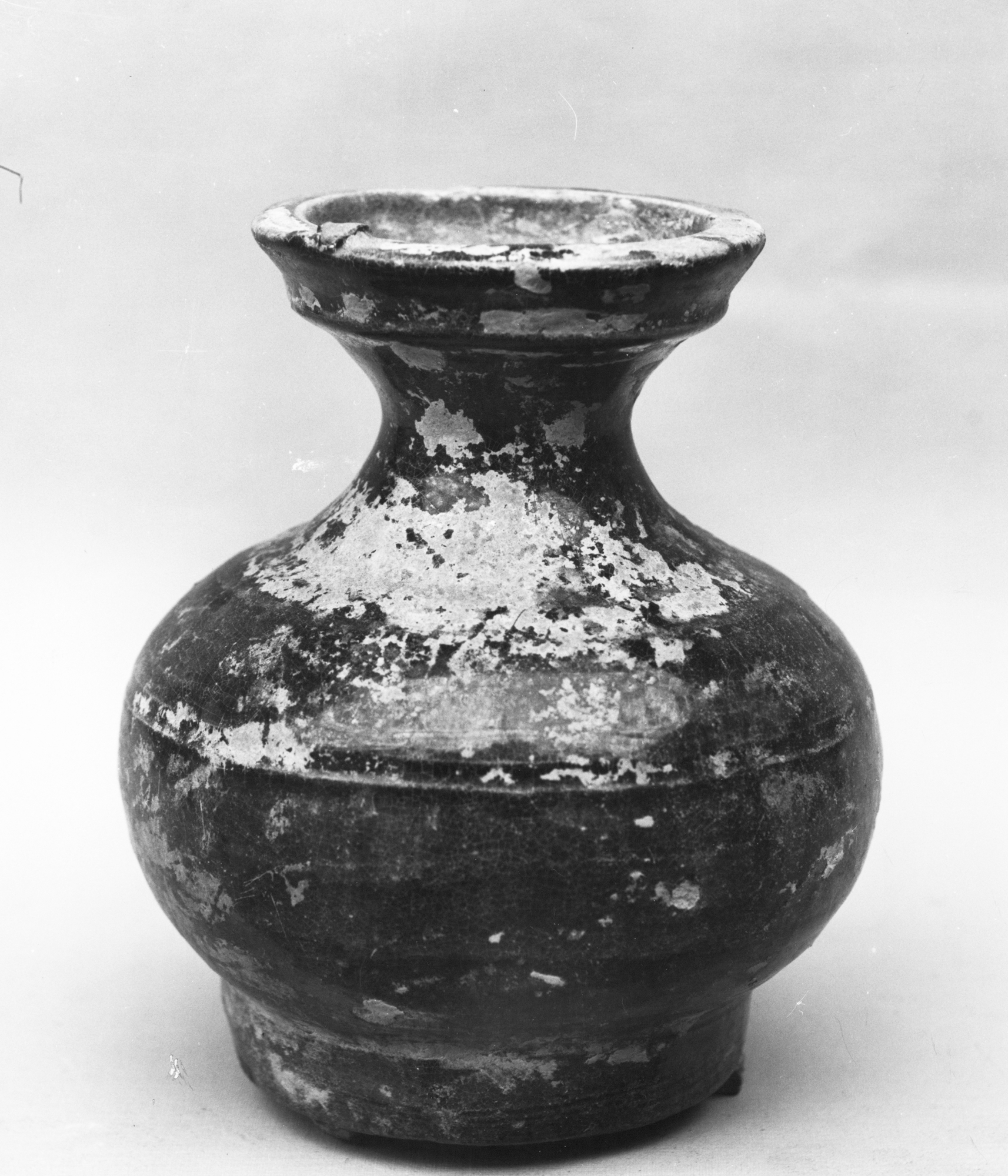 Pair of Vases by artist. Dark-colored vase with wide rounded body, short narrow neck, and wide mouth. The vase has a small foot. It appears to be made of ceramic or clay and has a rough, weathered texture with white patches, possibly from peeling glaze. The vase is symmetrical and centered in the image. A second vase, identical in appearance, is not shown but implied as a pair. The background is light-colored and featureless.