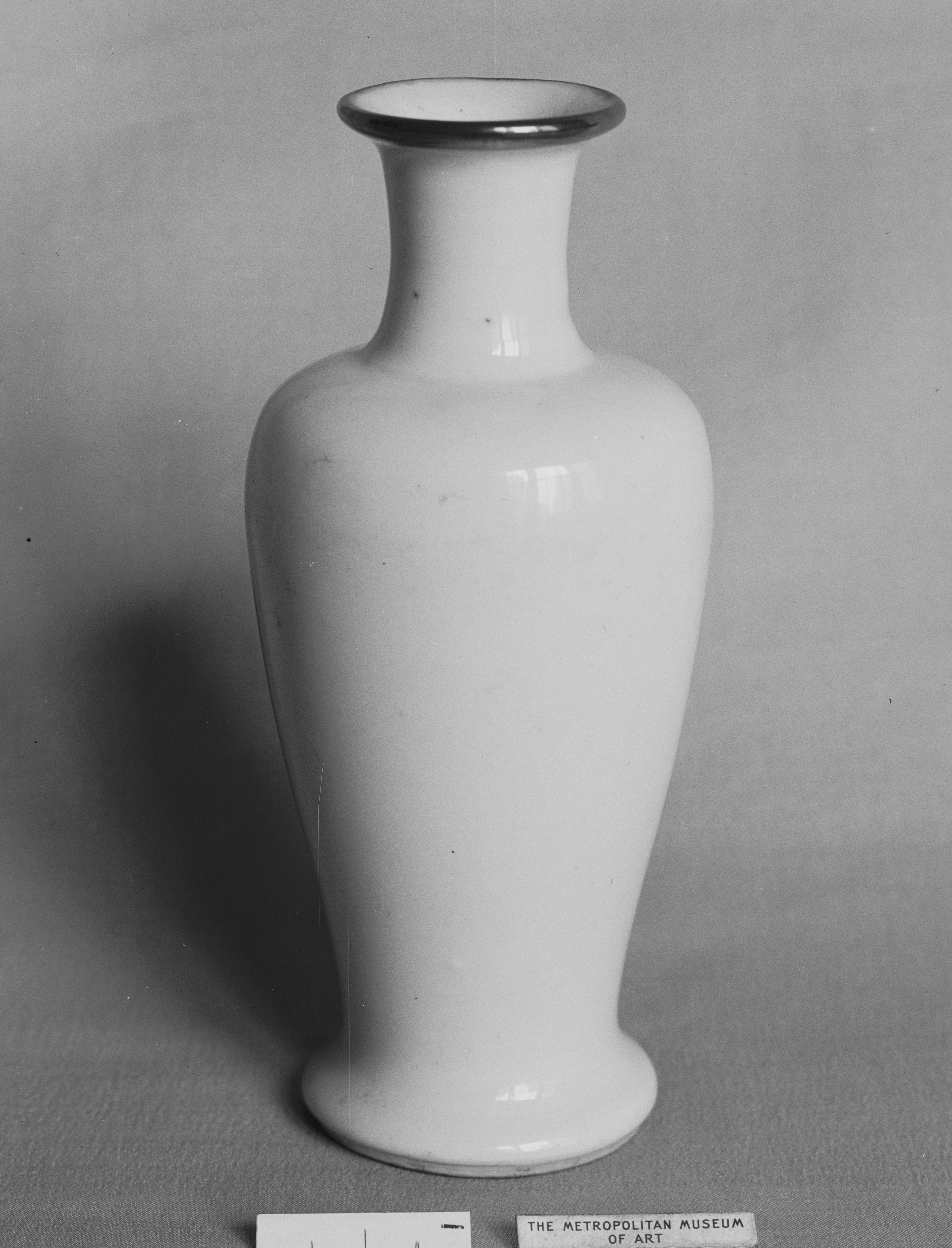 The vase, by artist unknown, is white with a narrow mouth and a wide body that tapers towards the bottom. A dark rim encircles the top edge of the vase. The base is rounded. A small white label with black text reading "THE METROPOLITAN MUSEUM OF ART" is placed in front of the vase. A small white scale is placed next to the label. The background is a plain gray surface with a shadow cast by the vase to the left.