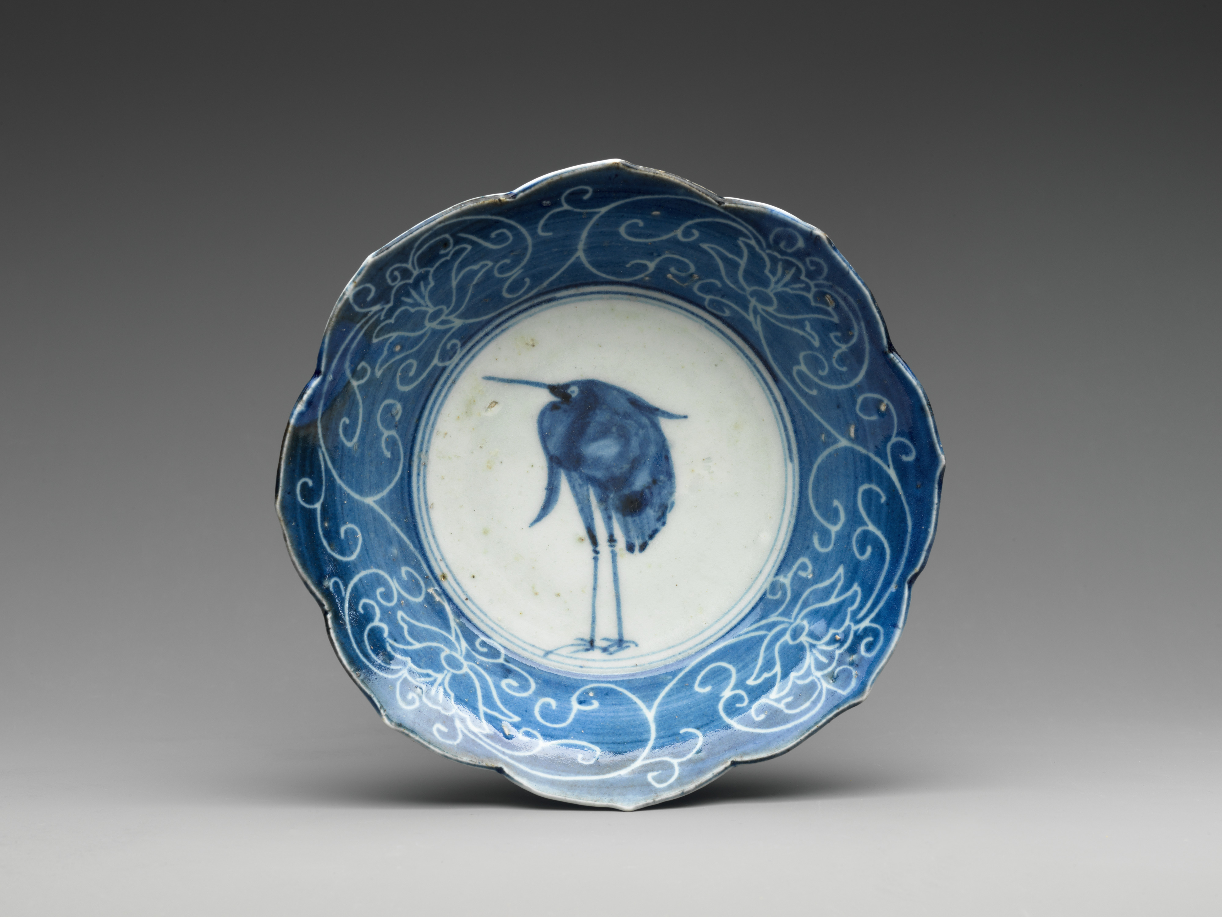 Blue and white bowl with scalloped edge, decorated with a blue egret standing on one leg in the center, surrounded by intricate white swirling patterns on the blue rim; the bowl has a white interior.
