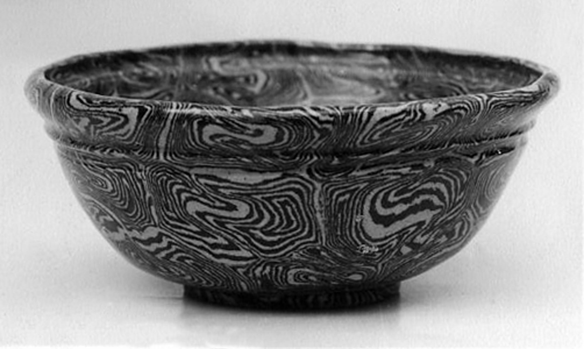 Black and white bowl by artist Kintsugi. Wide, shallow bowl with rounded body and small foot, made of dark-colored material with swirling pattern. Bowl has wide mouth and slightly curved rim. The swirling pattern features shades of black and white. The background of the image is a plain white surface.
