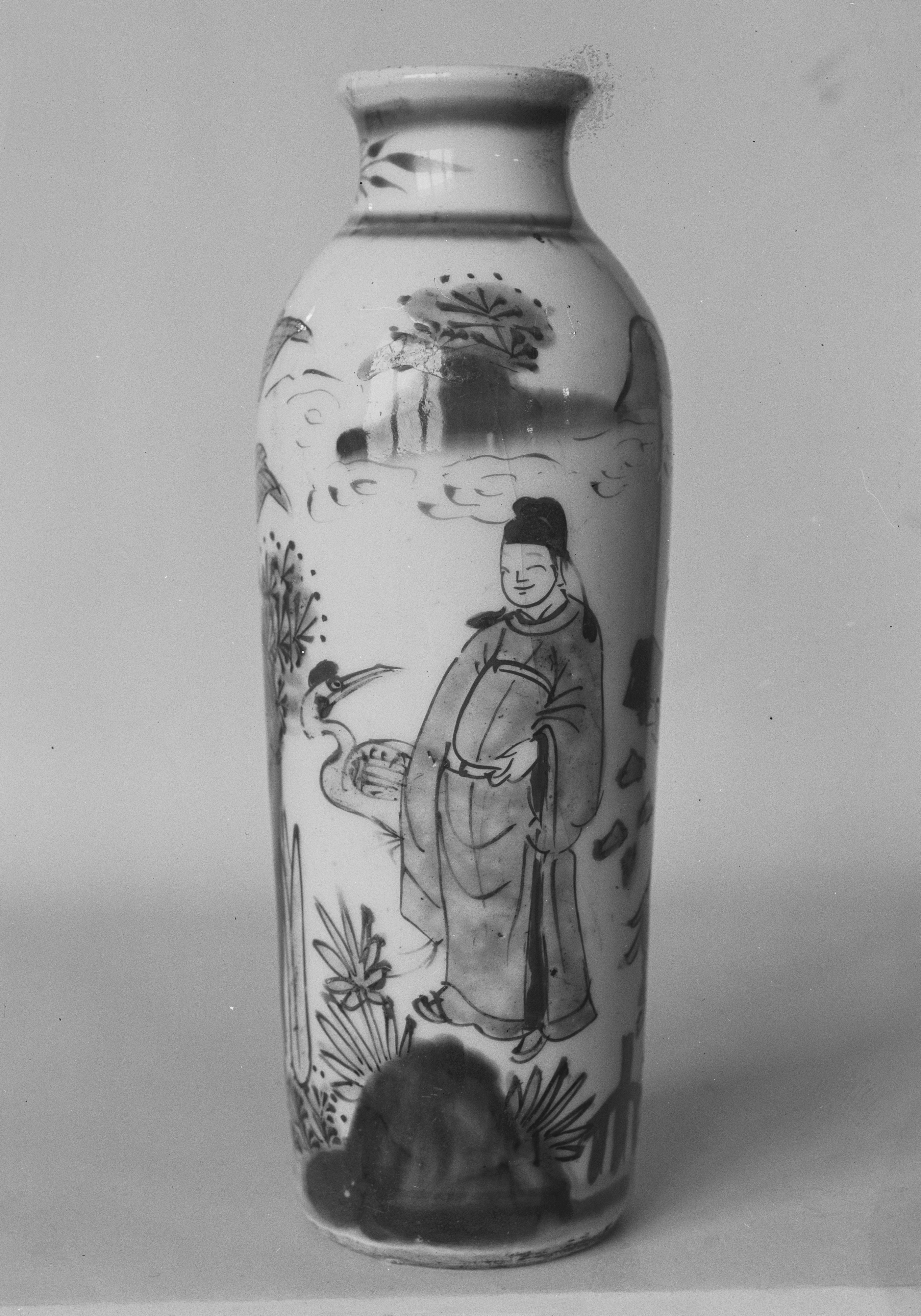 The image shows a tall, white vase with a narrow mouth. The vase has a rounded body that tapers towards the top with a small lip; the main body of the vase is decorated with a black design. A person wearing a robe with a sash around their waist and a hair bun is depicted on the vase. The person is holding a plate or tray in both hands. The vase also features various plants and foliage designs. The background of the image is a light gray color. The title of the piece is "Vase". The artist is unknown.
